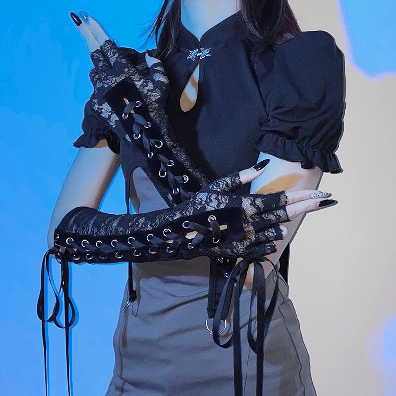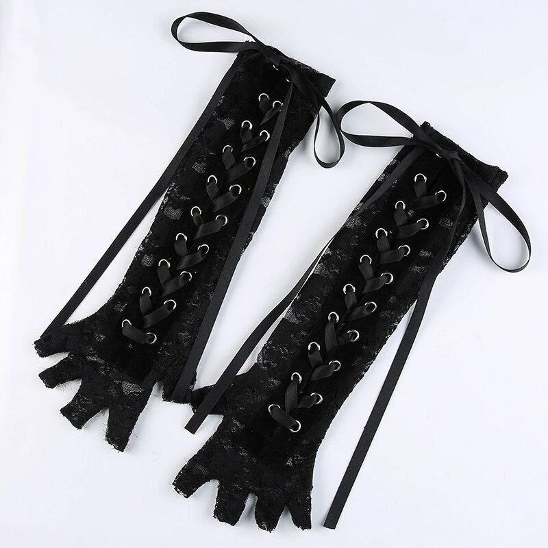 Darkness Within Lace Gloves cuz you’re a nightmare dressed like a daydream. Give in to your darkest desires in these sultry fingerless gloves that a sheer floral lace construction and lace up accents.