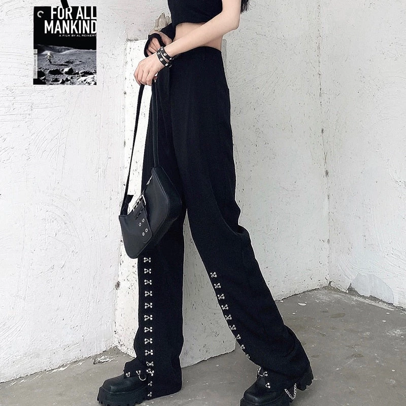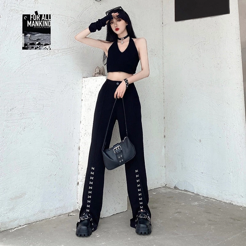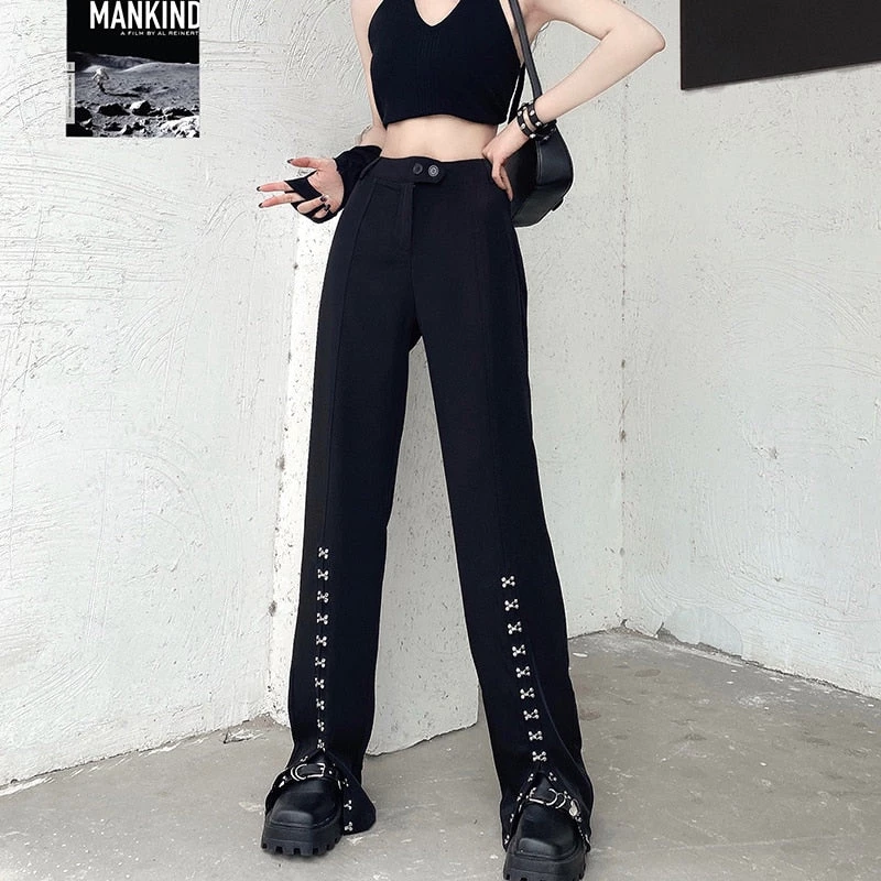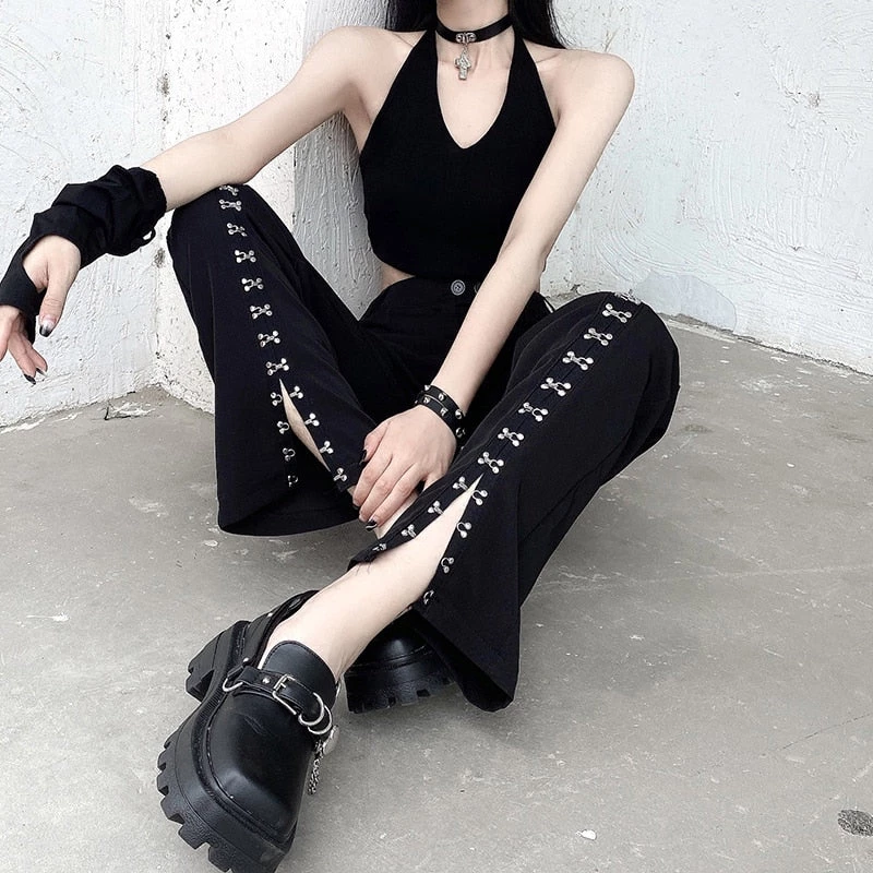 All Hooked Up Pants. These pants has a front slits with hook and eye closures, a flared fit and front button and fly closure.