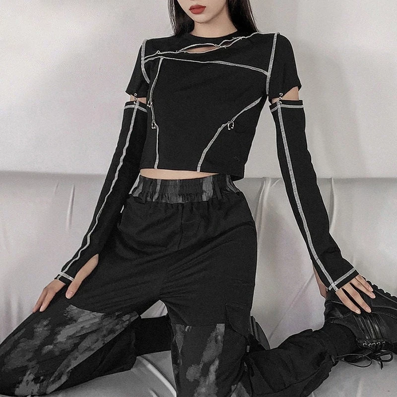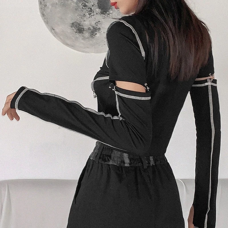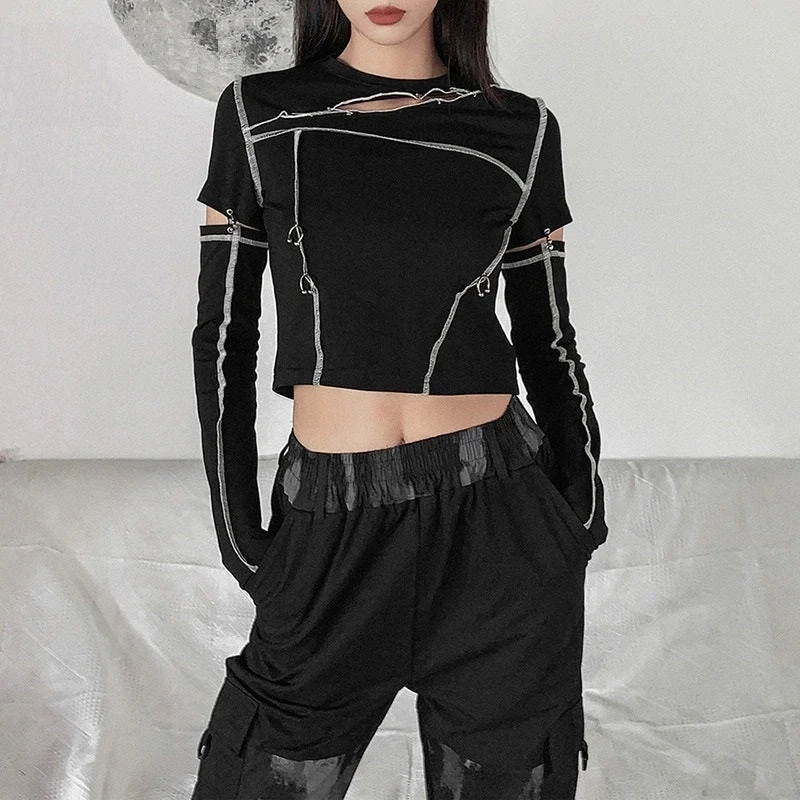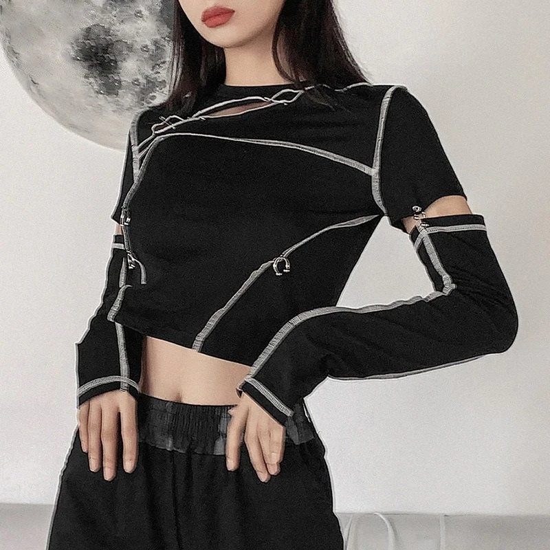 Cut Out Pierced Top got you raisin’ hell in the streetz. Fuel your rebel soul with this cut out top that has long sleeves, a cropped fit, and piercing hardware on the front.