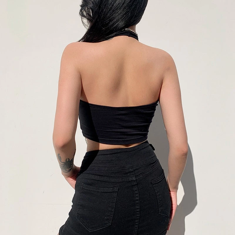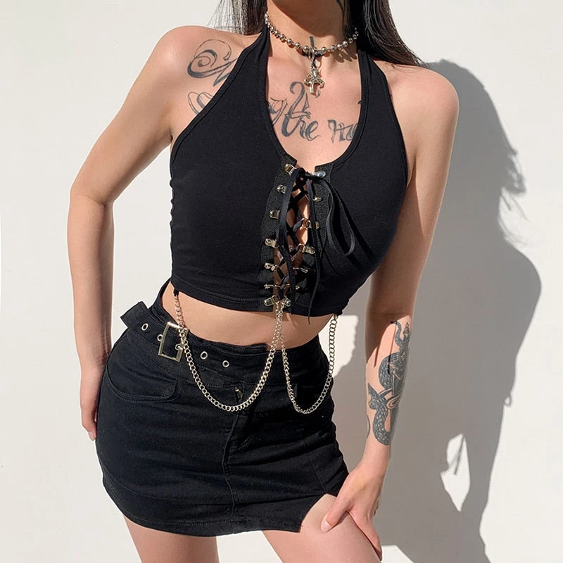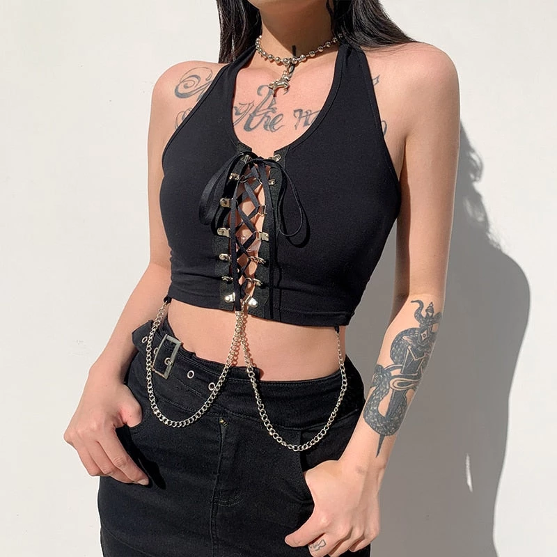 Hottie Behavior Lace Up Tank cuz you can’t be tamed. This cropped tank top has sexy cut out on the front with lace up and dripping chains.