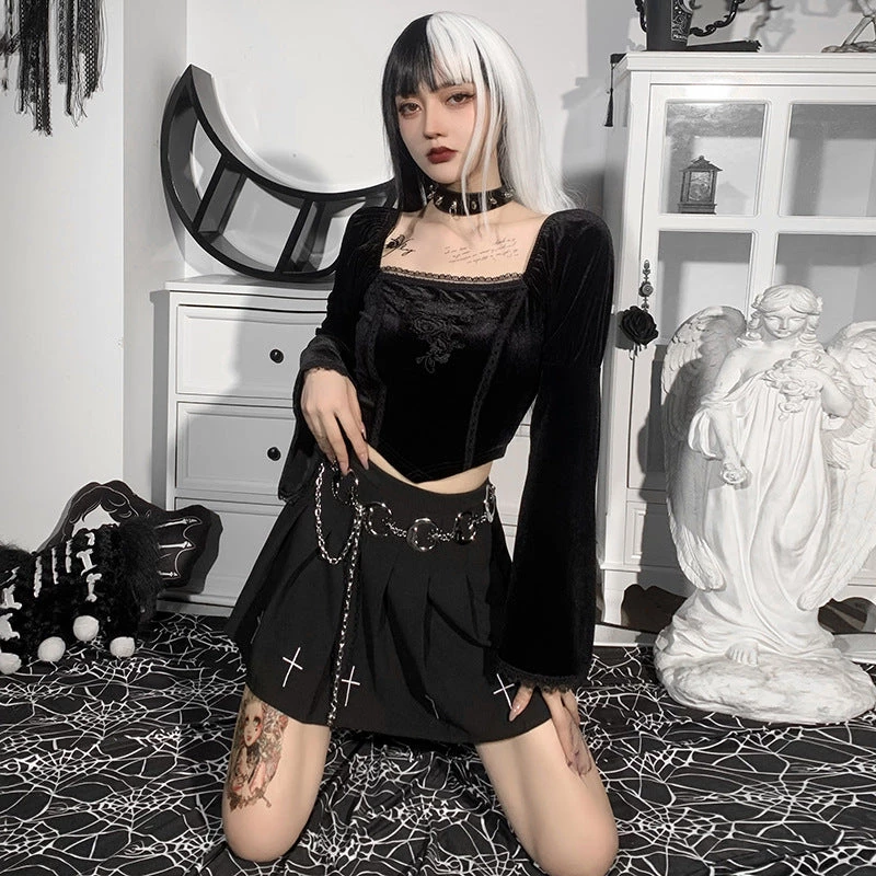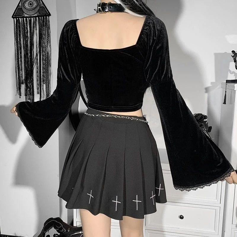 Immortal Bell Sleeve Top. This long sleeve crop top has a square neckline, flare long sleeves, lace trim and a v hem.