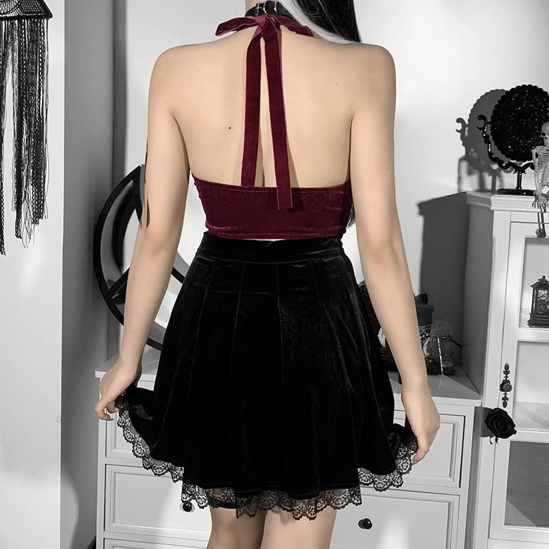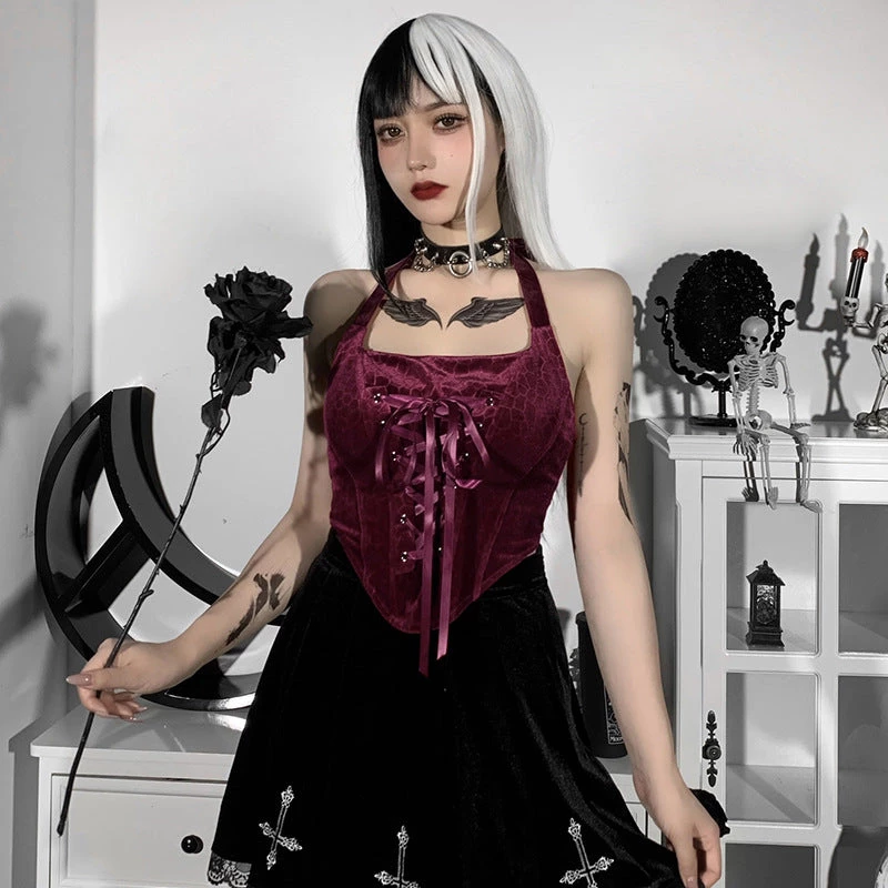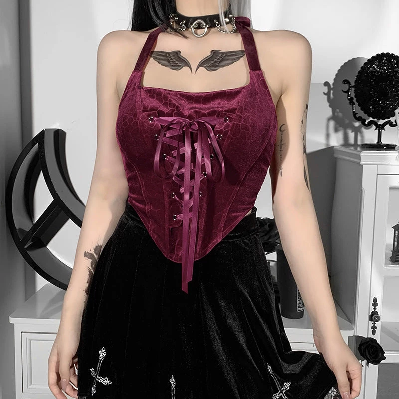 Love Hate Velvet Top. This red wine velvet corset top has a cropped fit with lace-up detail on the front.