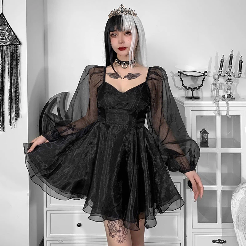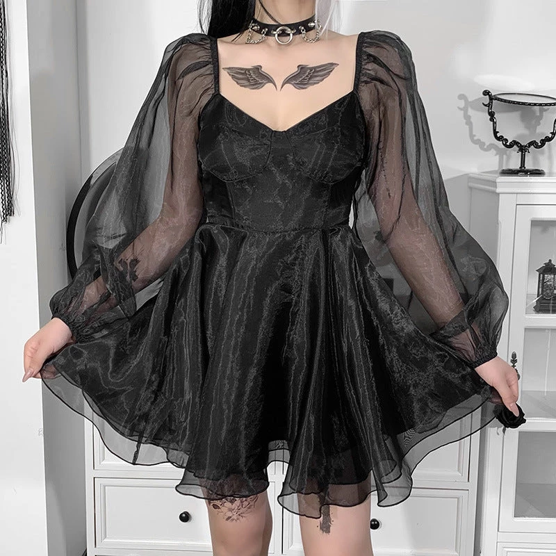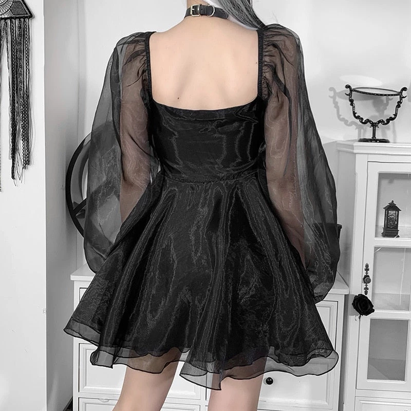 Night Temptress Babydoll Dress. This mini babydoll dress has organza sheer construction, long puff sleeves sleeves and a flare skirt fit.