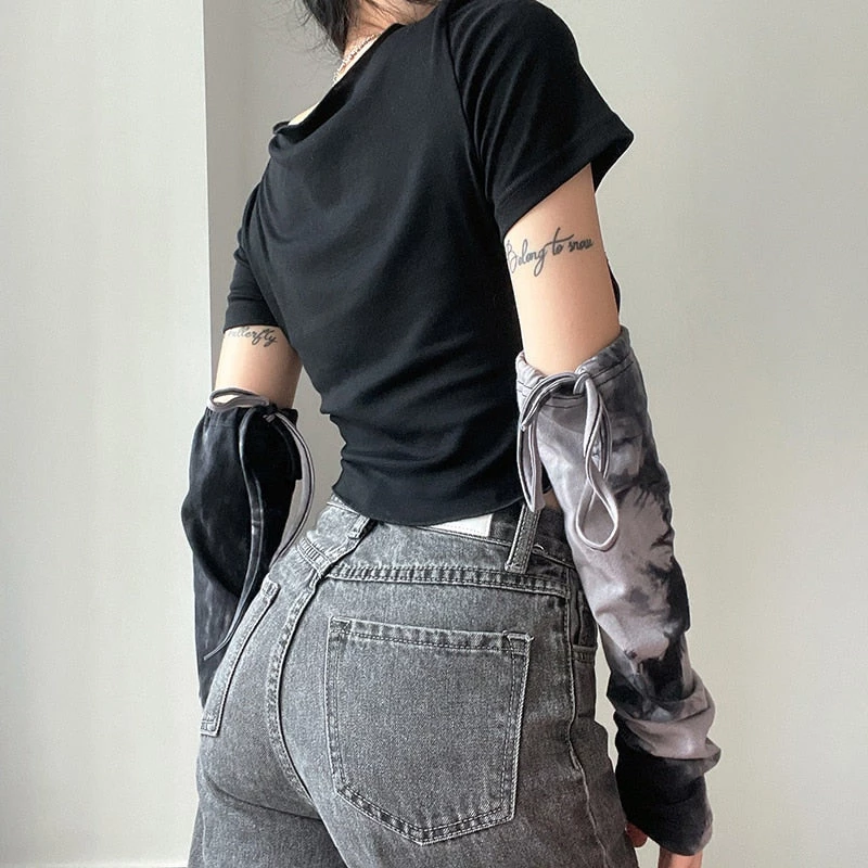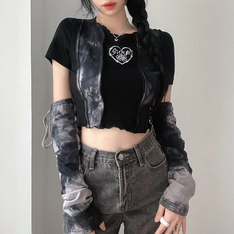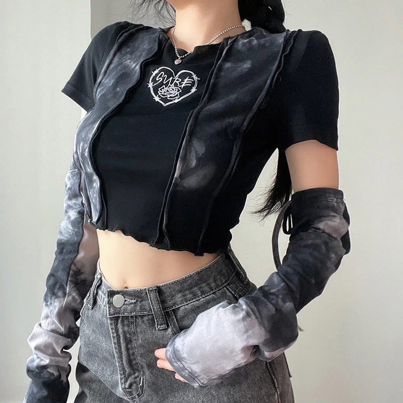 Rebel Heart Top & Gloves Set keep your heart under lock & key. This top features a tie dye colorblocks design, lettuce trim and a matching tie dye fingerless gloves.