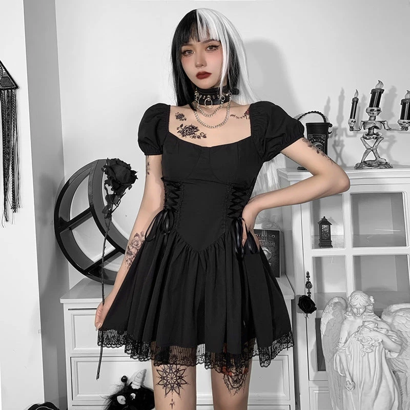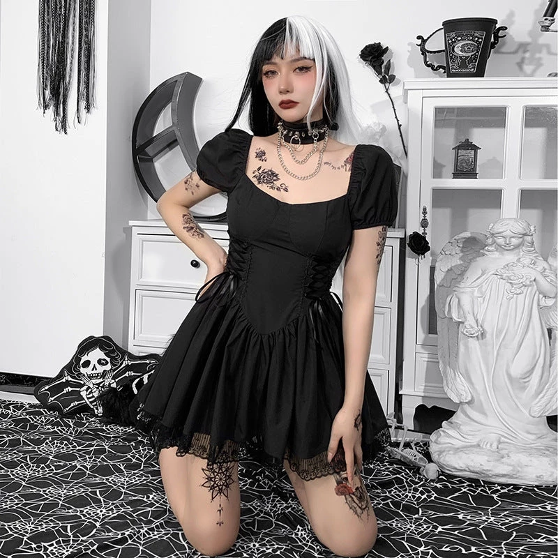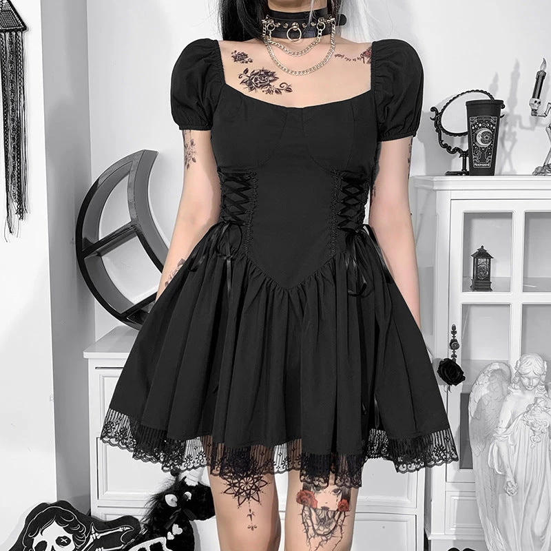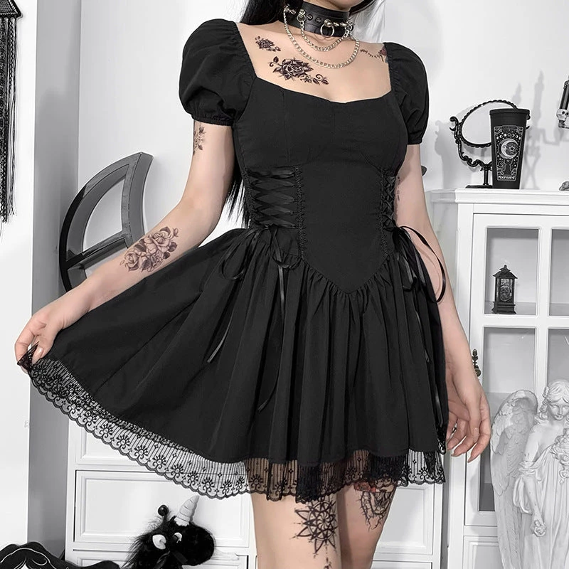 Shadow Kiss Babydoll Dress. This babydoll dress features short puff sleeves, lace up details at the sides, lace trim and a tiered skirt.