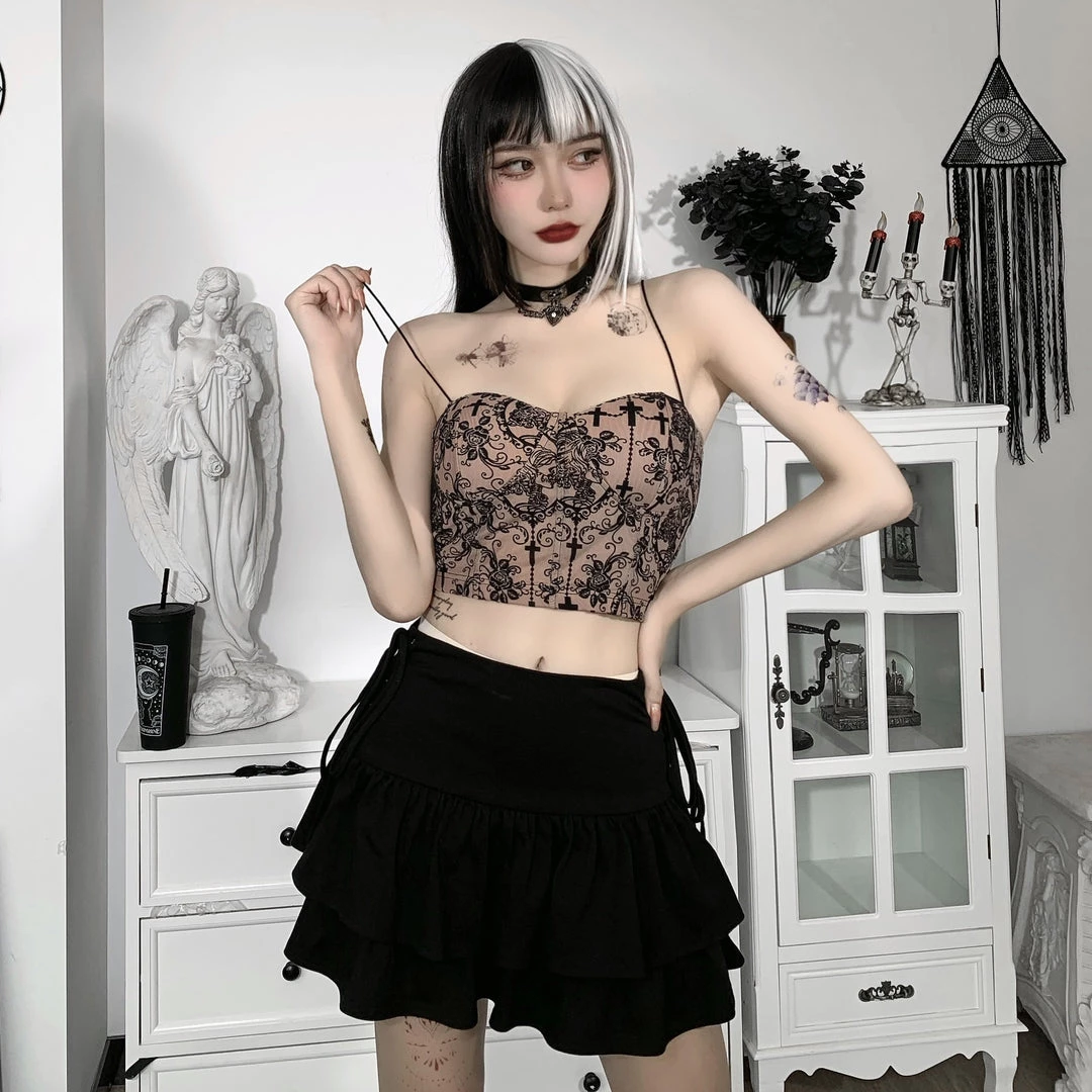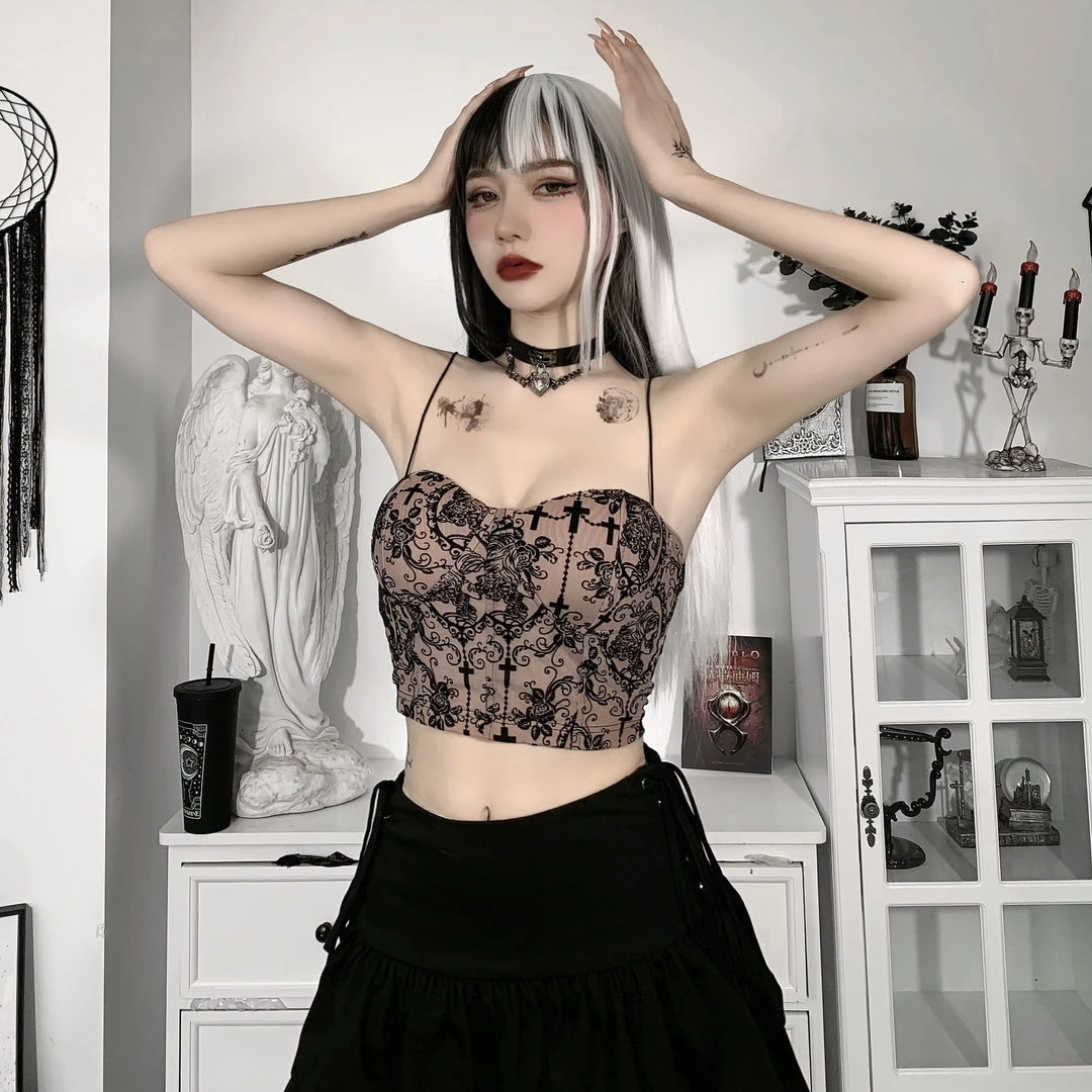 Unholy Desire Tank Top. This tank top has a floral and crosses pattern graphic construction and spaghetti straps.