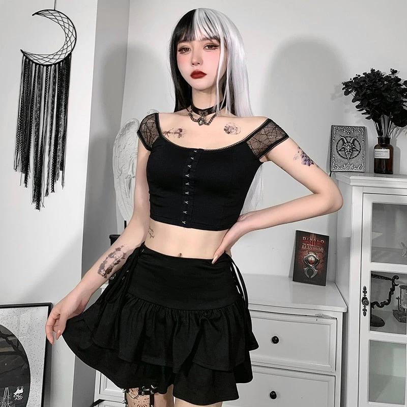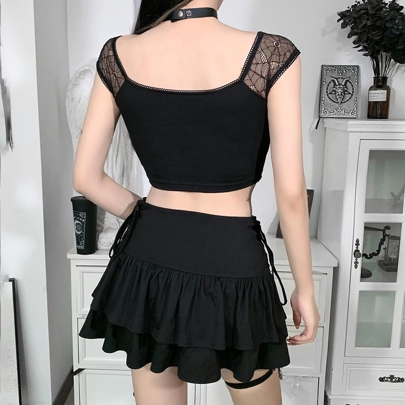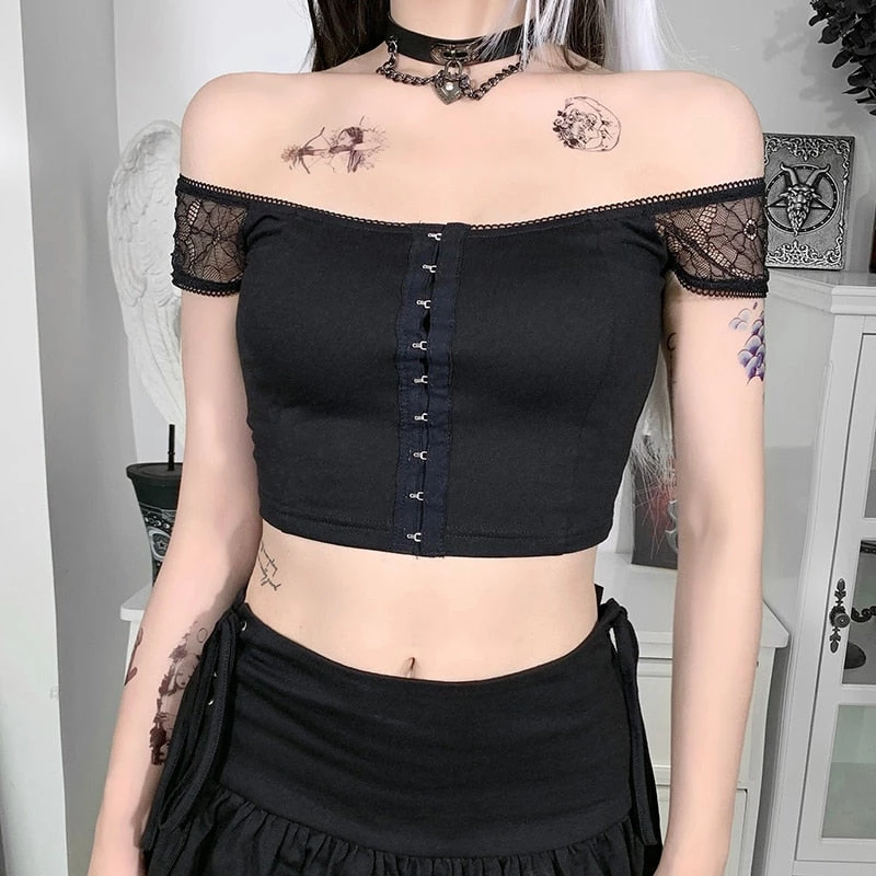 Web Of Secrets Top everyone’s stuck on you babe. This off the shoulder crop top has a spiderweb lace sleeves design and front closures.