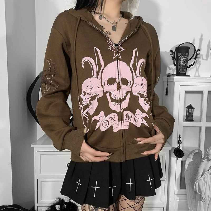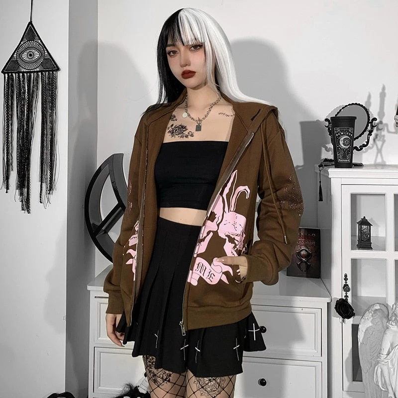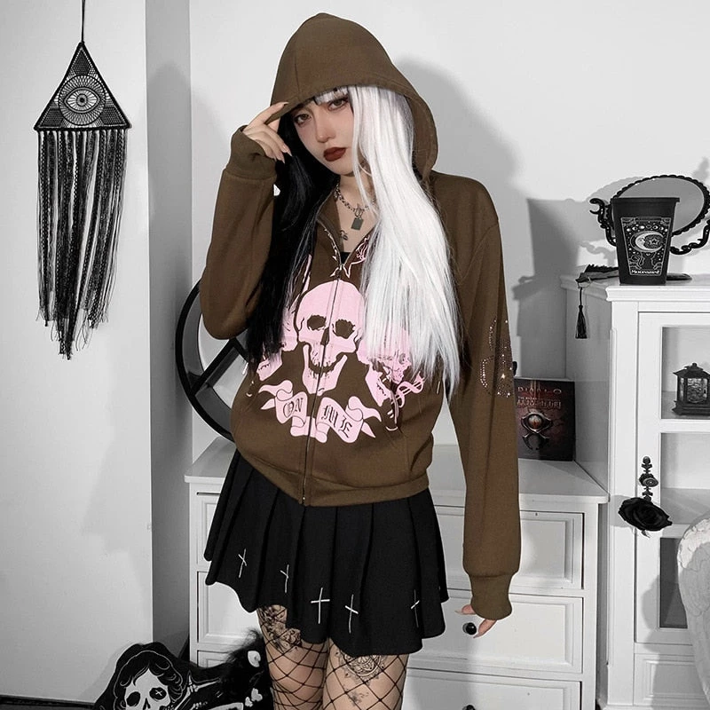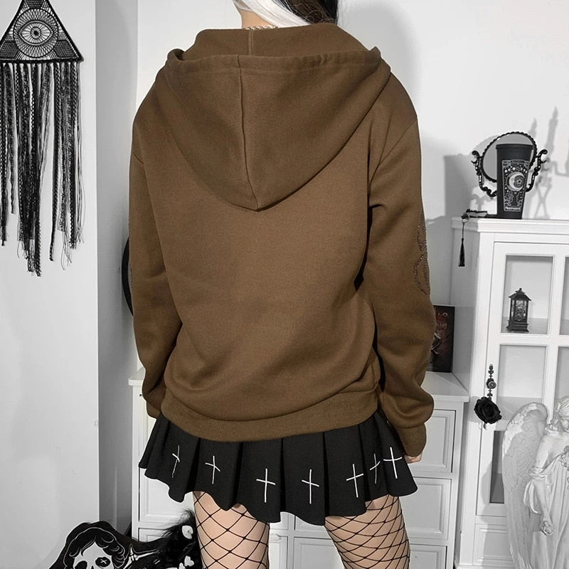 Deadly Doom Zipper Hoodie. This zipper hoodie has a relaxed fit, two front pockets, skeleton graphic on the front and a spider rhinestones on the sleeves.