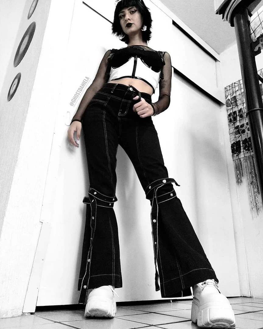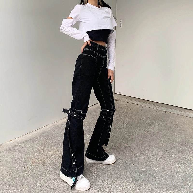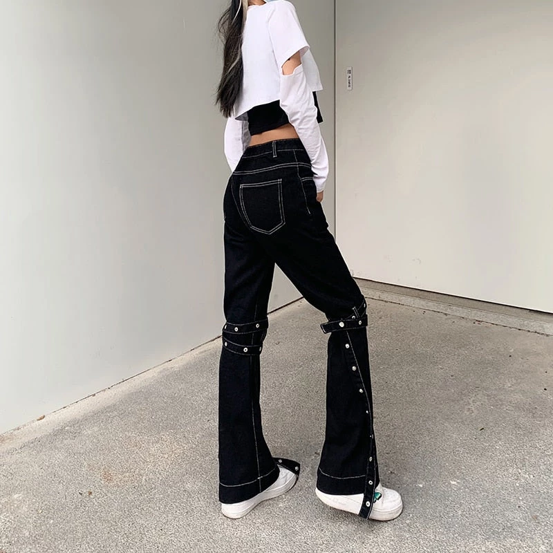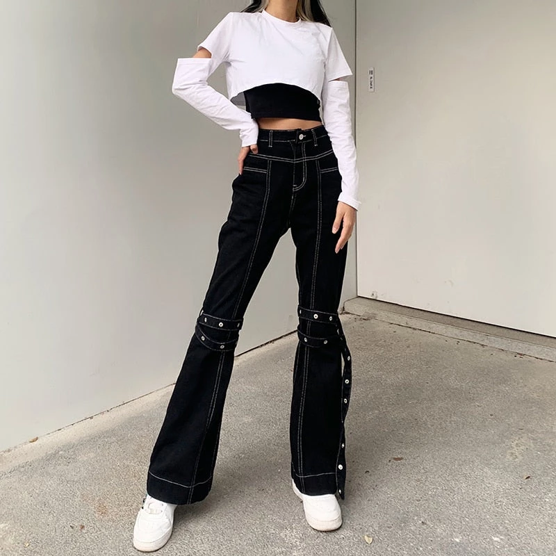 Eazy Breezy Flared Pants cuz ya always make it look so eazy breezy! Be the ultimate babe in these cute flared pants that have contrast stitching all ova, four pocket , a front zip closure and and bondage straps on the legs.