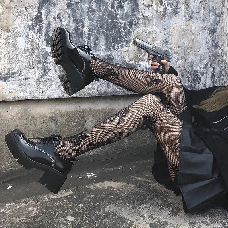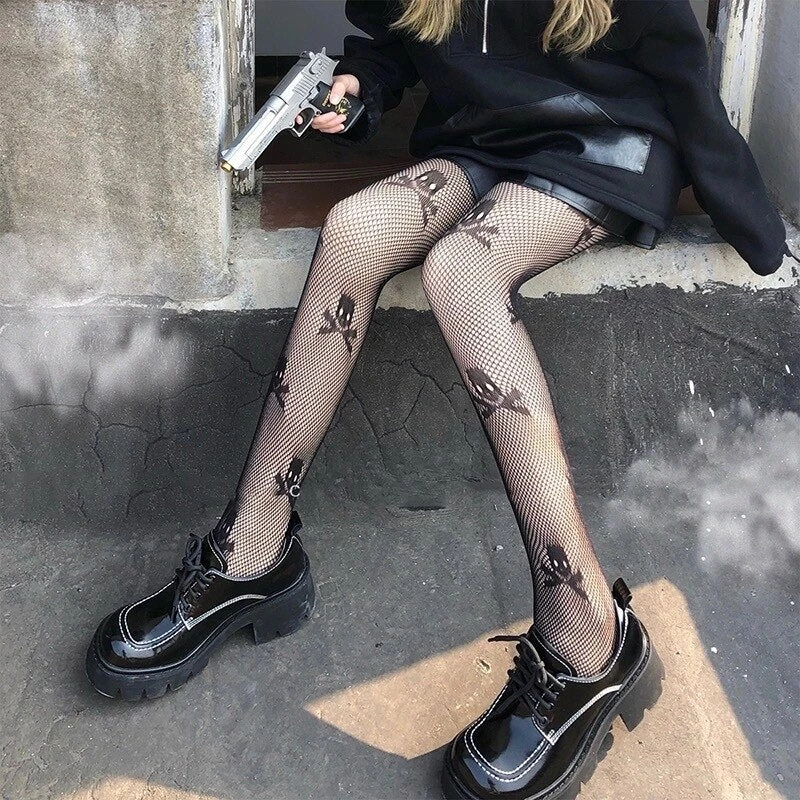 Fishnet Skull Stockings. These fishnet stockings feature skulls all over.