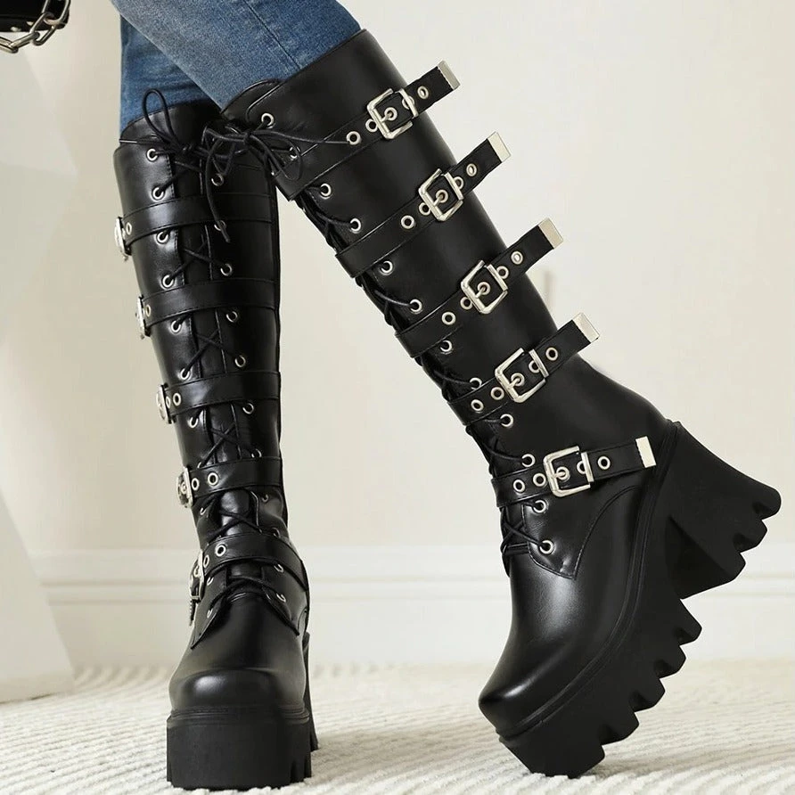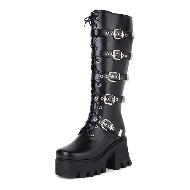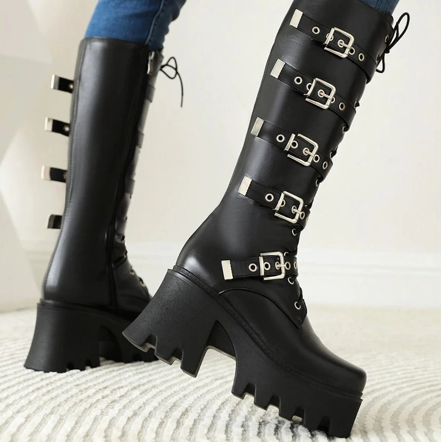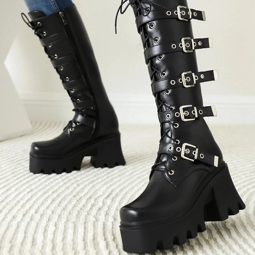 Hella Bad Buckle High Knee Boots. These knee-high boots has chunky platform soles, buckles and a front lace up closures and an inside zipper closure.