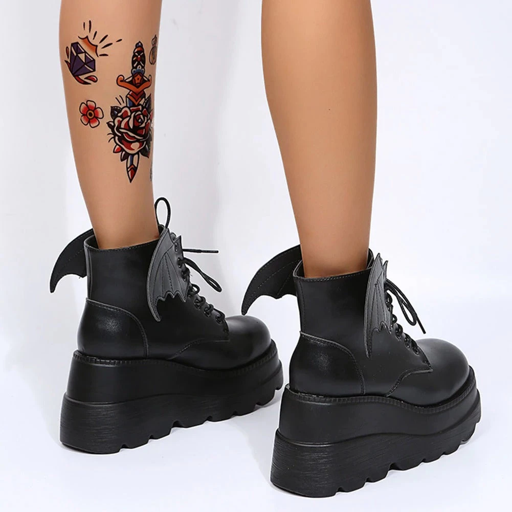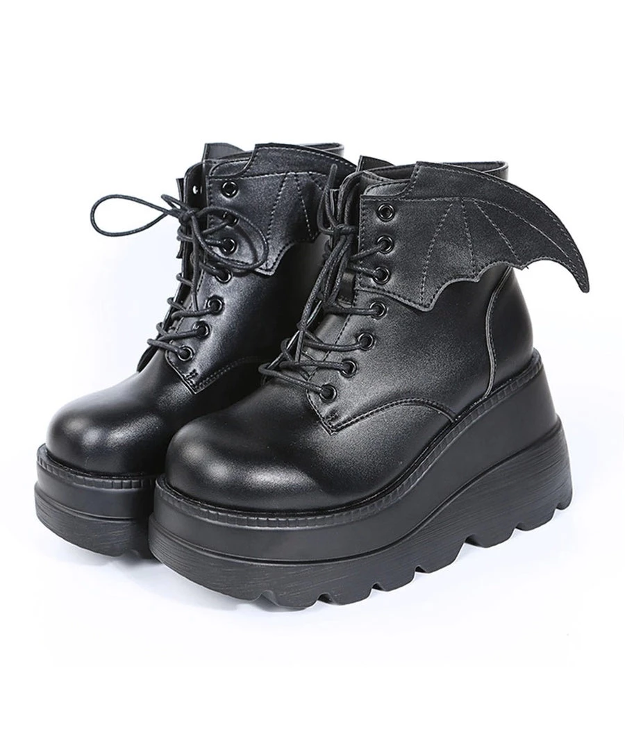 Hell Raiser Platform Sneakers. These amazing platform sneakers are constructed outta black vegan leather with epic 3D bat wing details at your ankles. Featuring front laces that you loop through your wings and a chunky platform soles.