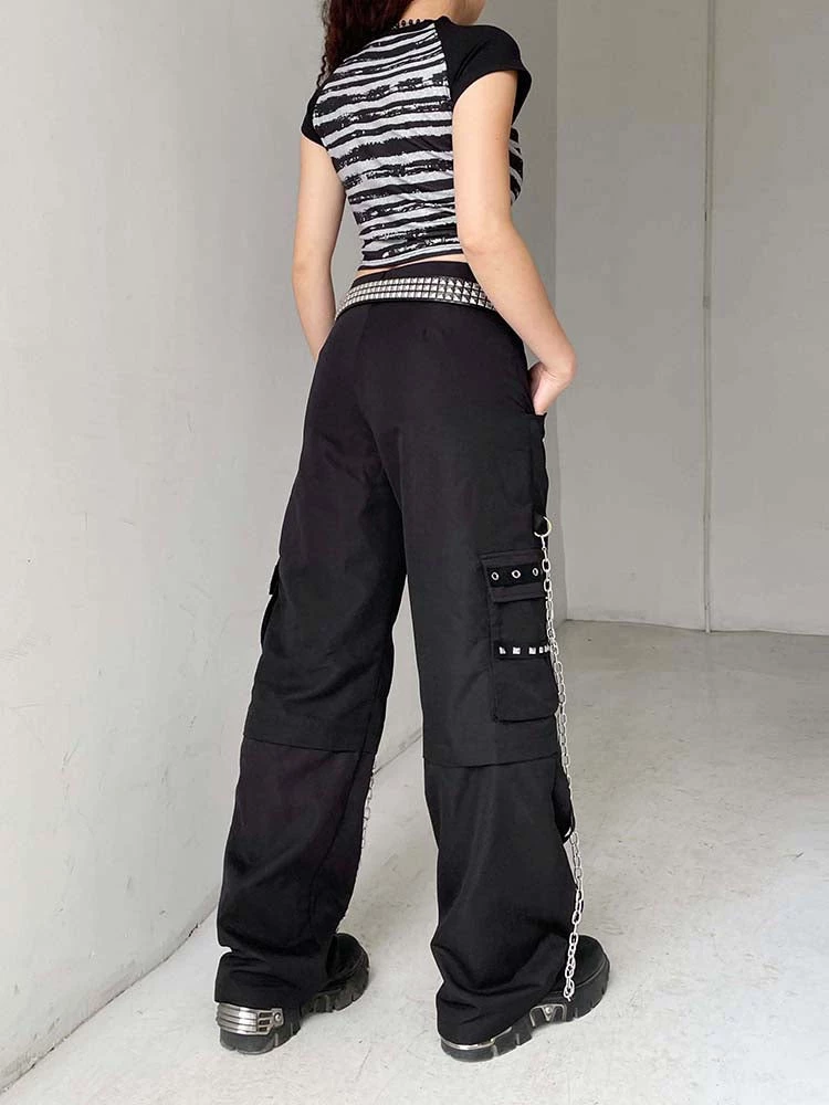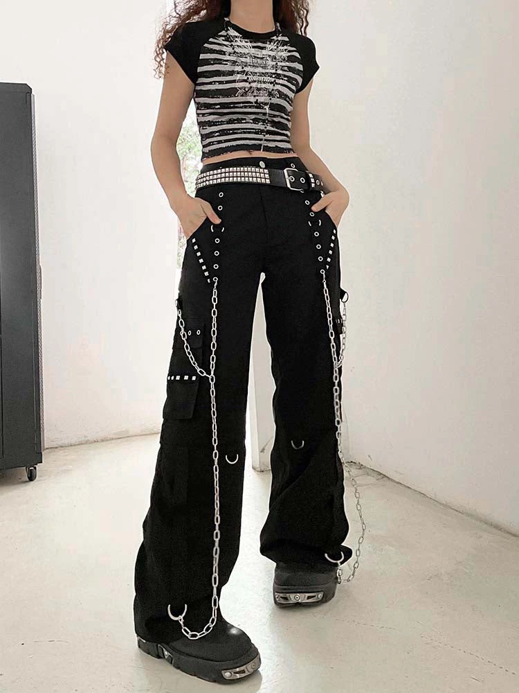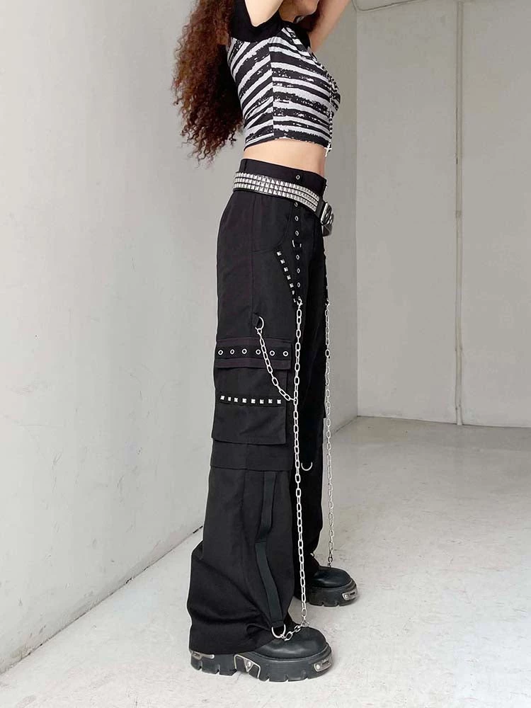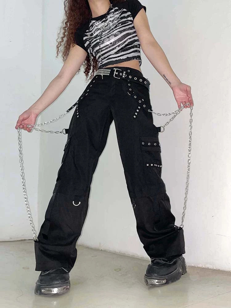 Hungry For Power Chain Pants. These pants come in a cargo construction, with, metal eyelet and stud details, chain details and side cargo pockets.