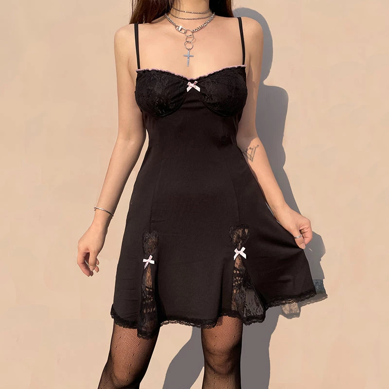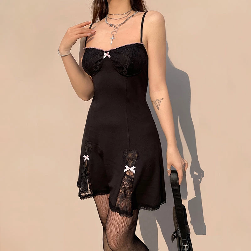 In High Demand Dress. This slip mini dress has a sheer floral panels, lace trim, cami straps and decorative satin bows.