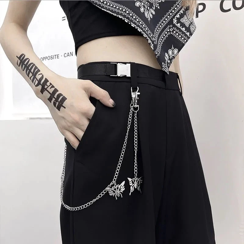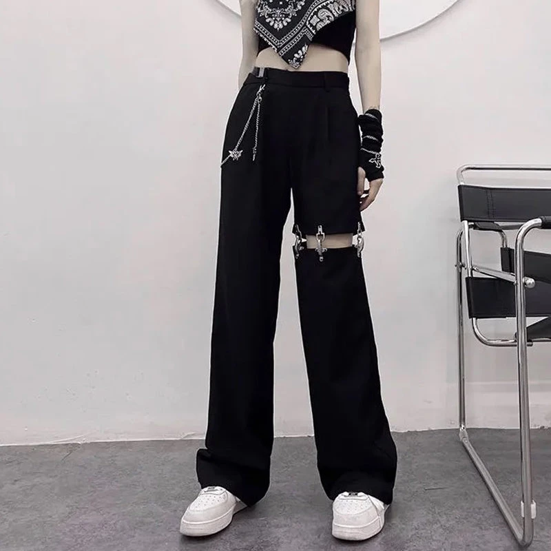 Linked Up Cutout Pants. These wide pants have a high-rise fit, pockets on the front, leg cut out with metal hardware and side waist butterfly chain.