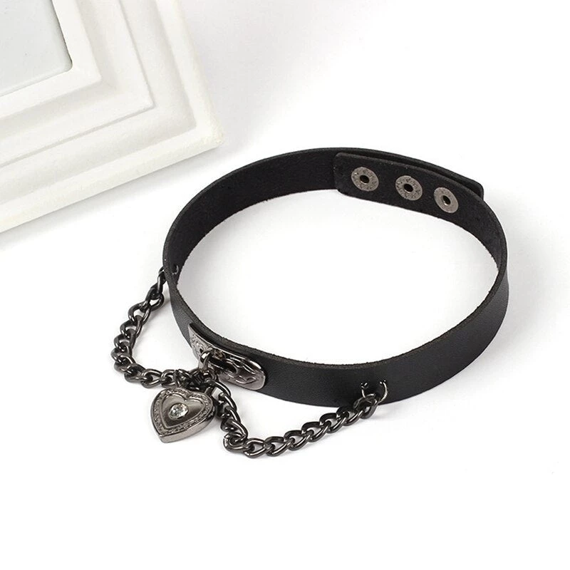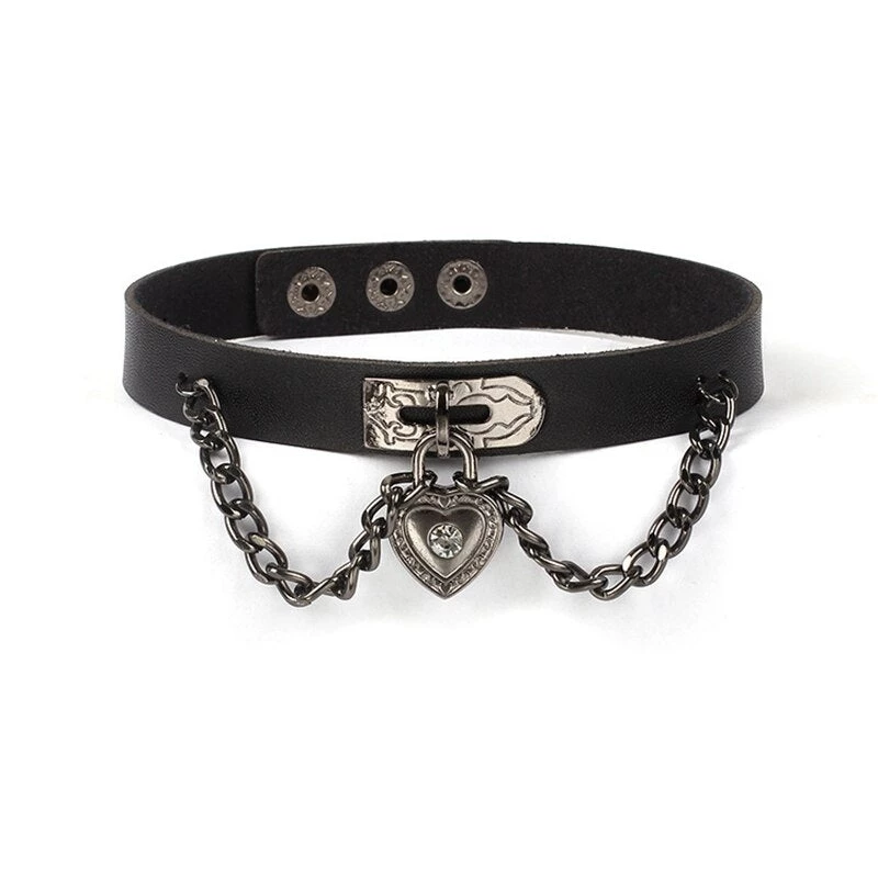 Love Locked Down Choker, can we just chain ourselves to you? This vegan leather choker has chain hardware all over and a heart shaped pendant on it.