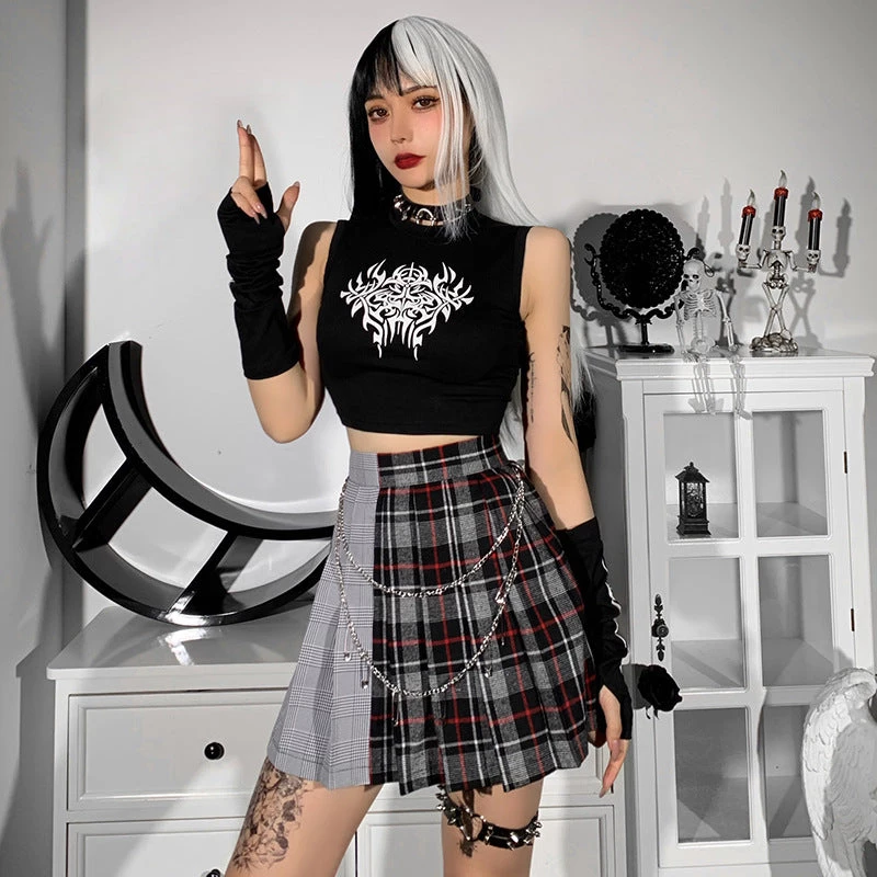 Machiavellian Plaid Mini Skirt. This mini skirt has two half plaid constructions with a pleated design, a waist chain with safety pins and a side zipper closure.