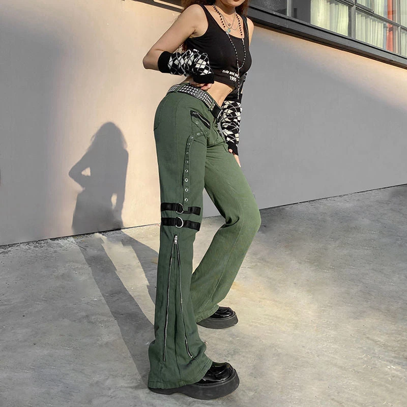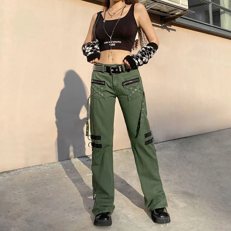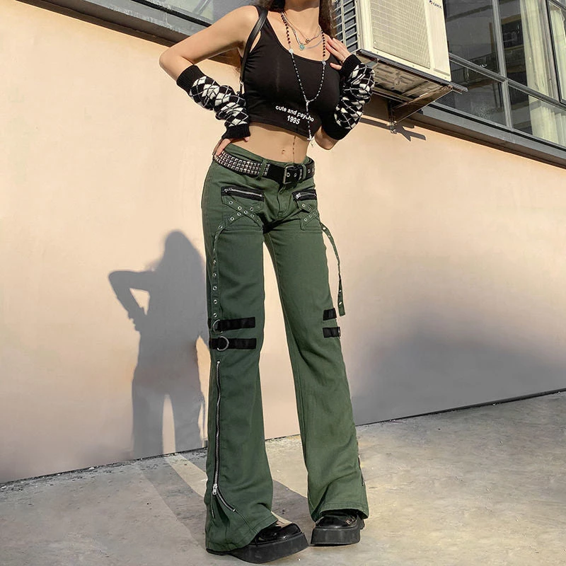 My Rules Cargo Pants. These low rise pants have a utility style with exposed zipper details, side straps with eyelets and a zip fly closure.