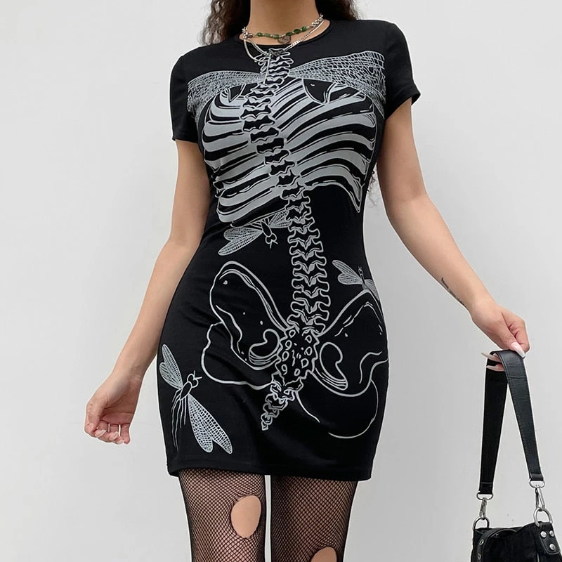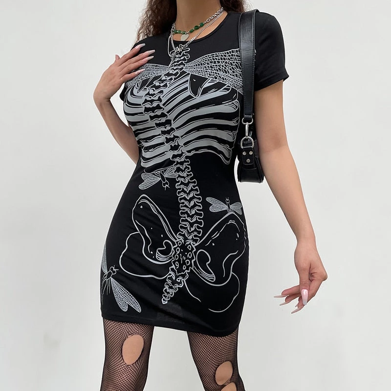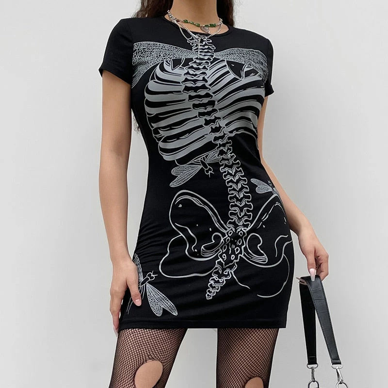 Cold To The Bones Dress. This black mini dress has short sleeves and freaky skeleton graphics on the front.