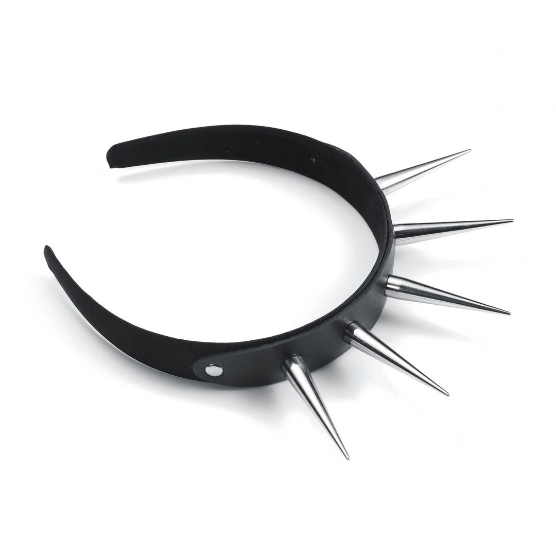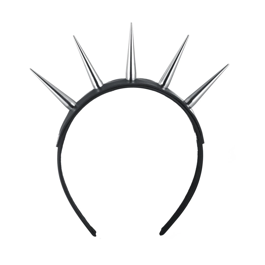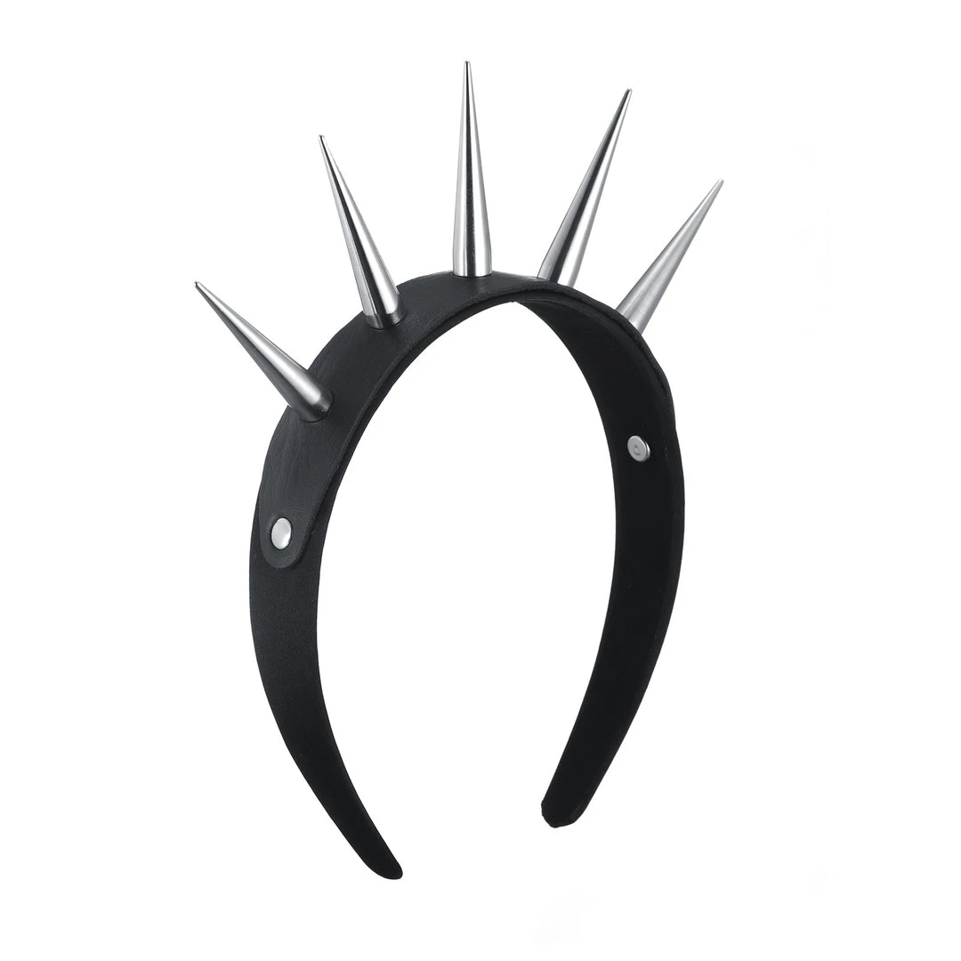 Danger Zone Spiked Headband. This headband features a black flexible band and a vegan leather strap with bif silver metal spikes across the top.
