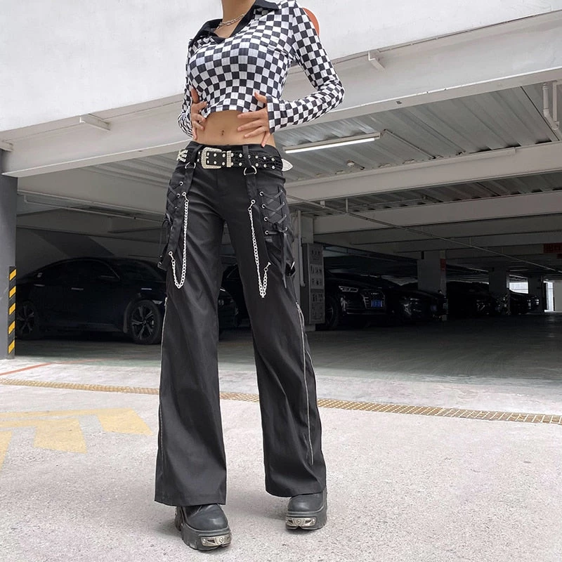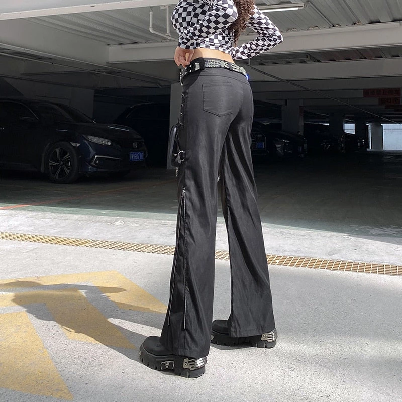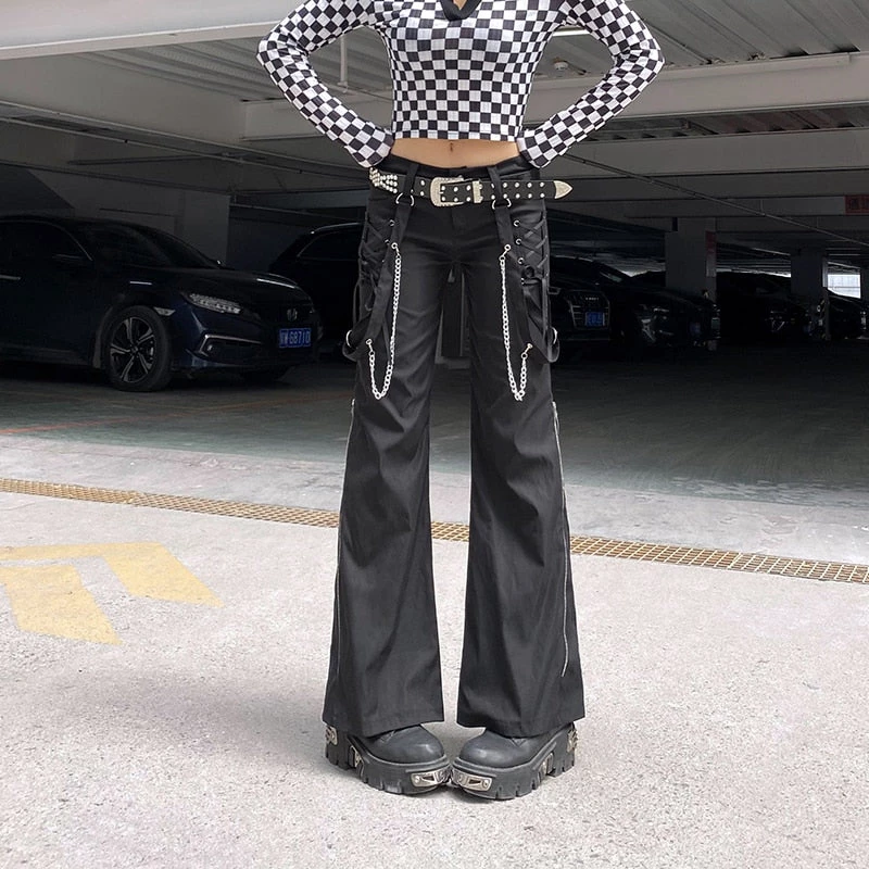 Do My Thing Pant. These flared pants has side lace-up details, bondage straps with chains and side zippers across the legs.