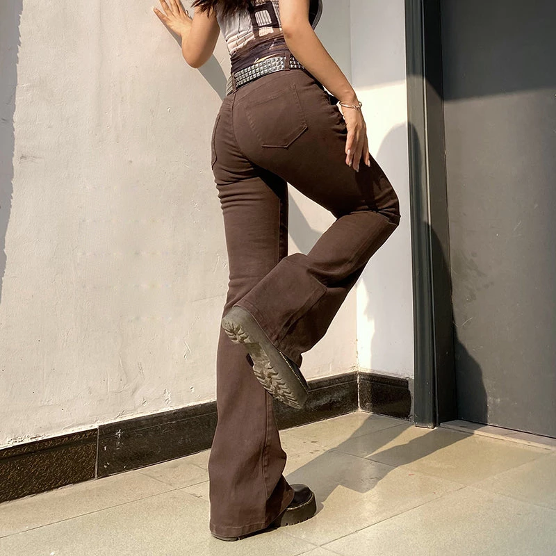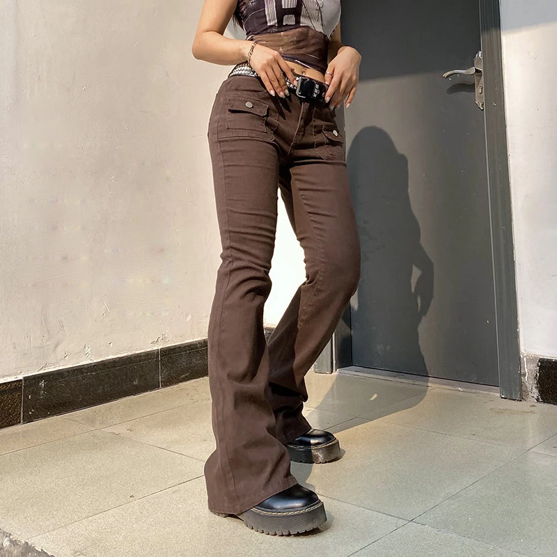 Don’t You Forget Flare Pants. These brown pants has front utility pockets design, a mid rise waistline, a flare fit and pockets in front and back.