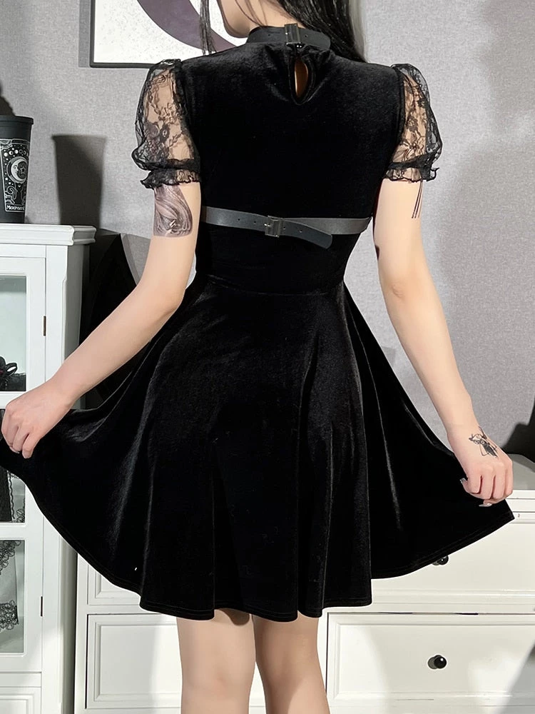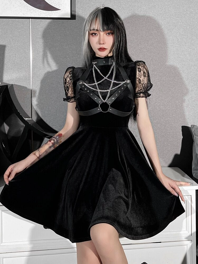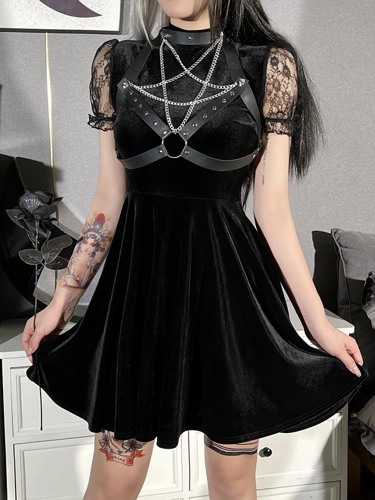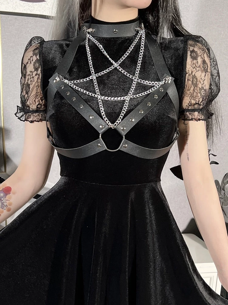 Evil Nights Harness Dress has a velvet construction, short lace puff sleeves, a flowy skirt and a vegan leather pentagram bust harness with chains and studs.