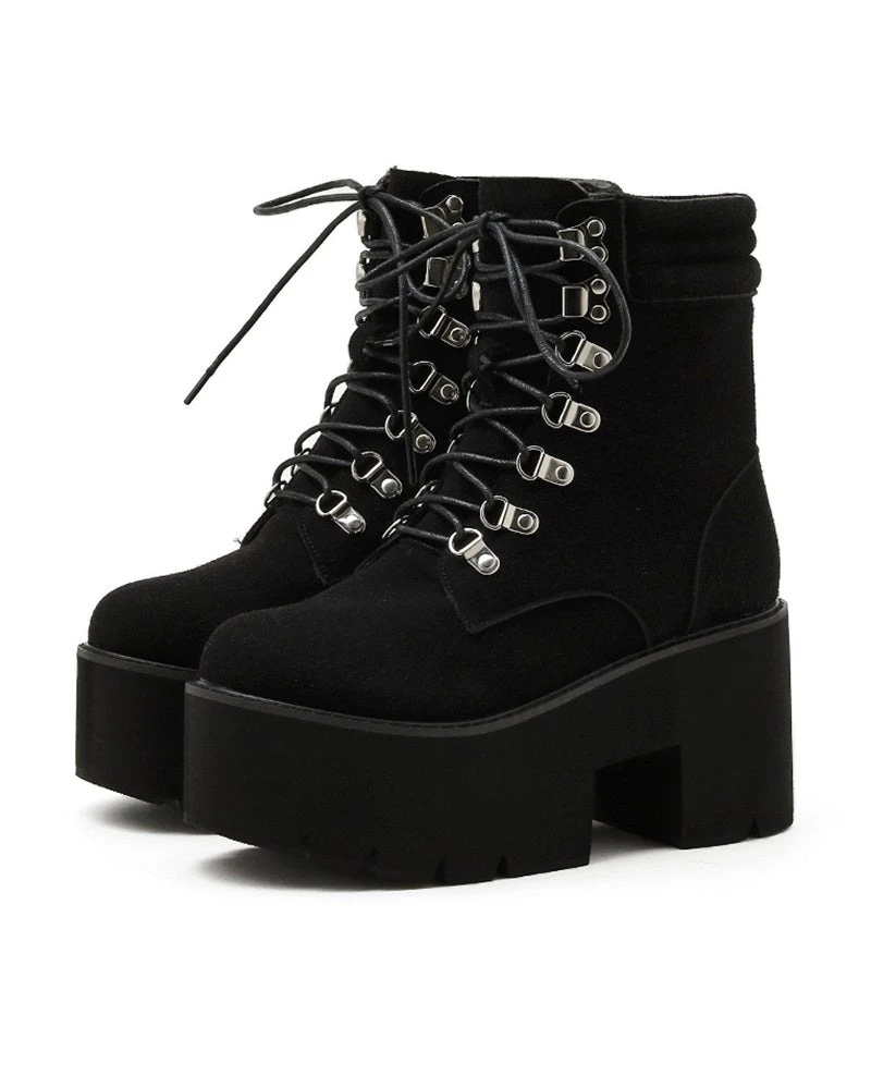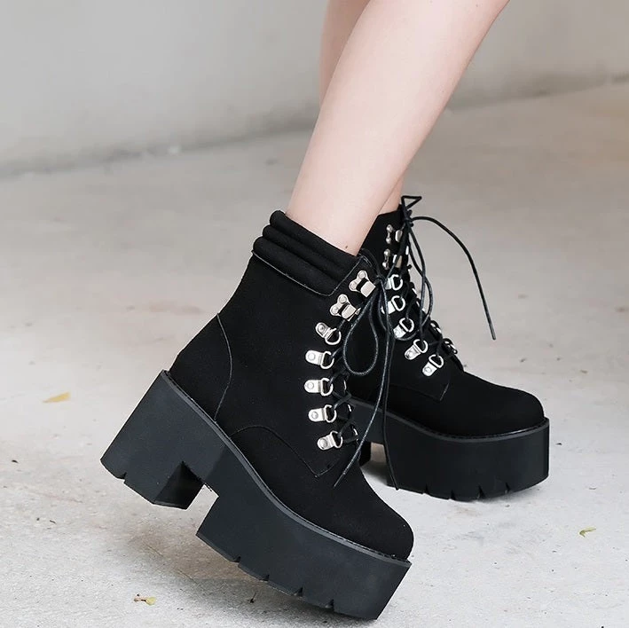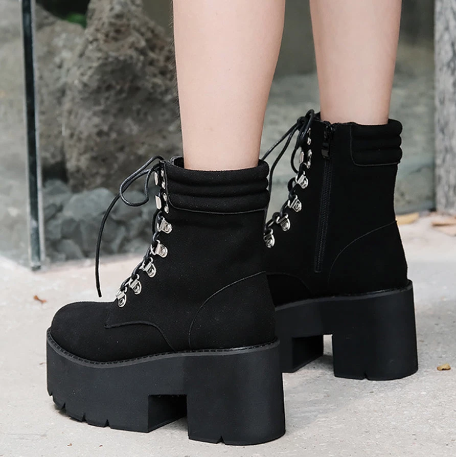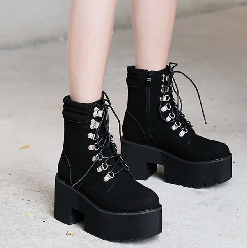 Go To Werk Boots. These vegan leather booties have chunky platform soles, side zipper closures and lace-up closures.