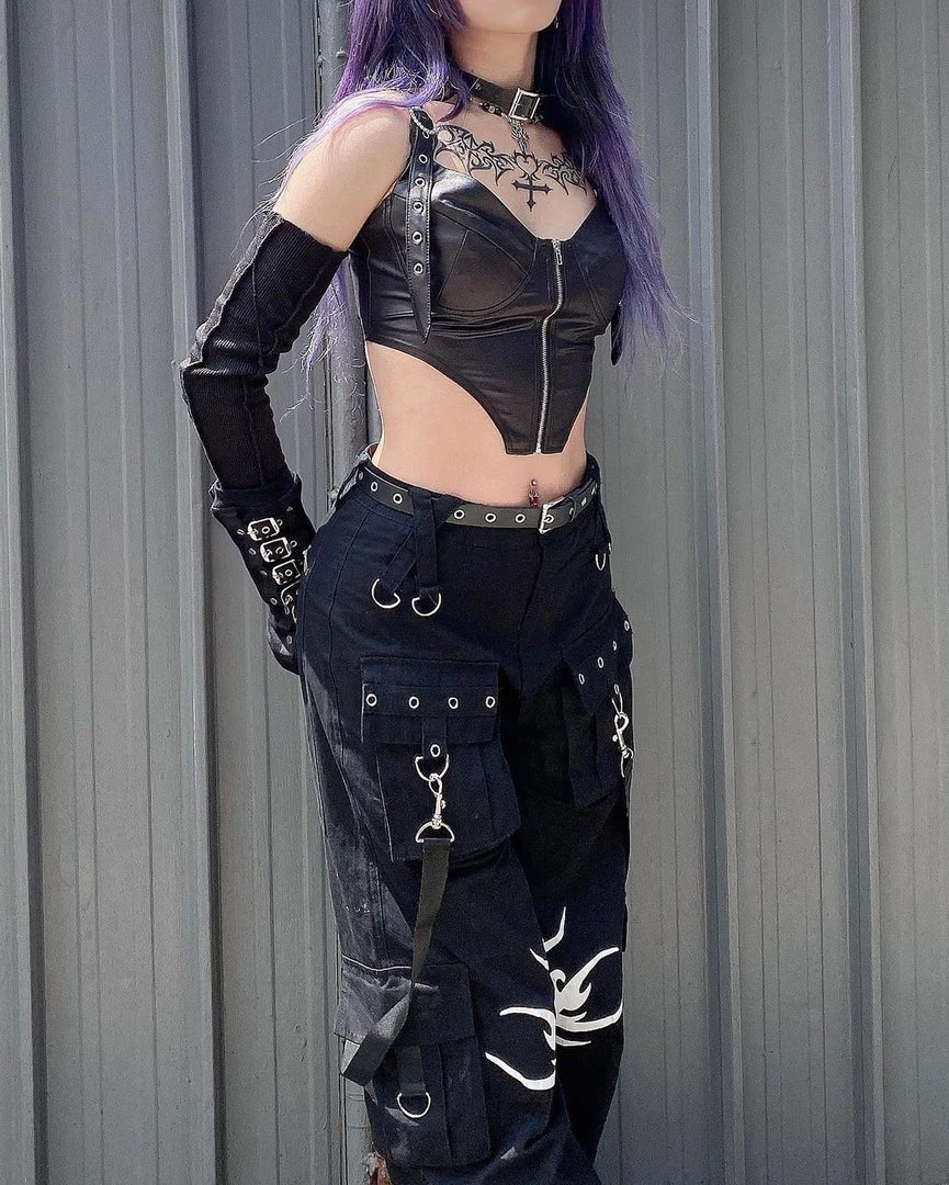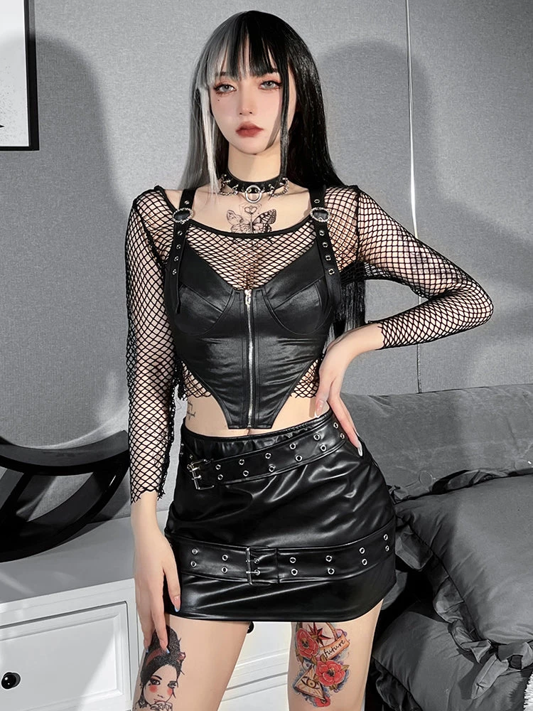 Law Breaker Corset Top. This corset top has a vegan leather construction with a V-neckline, high cut waist, a zip up closure on the front and grommet buckle straps.