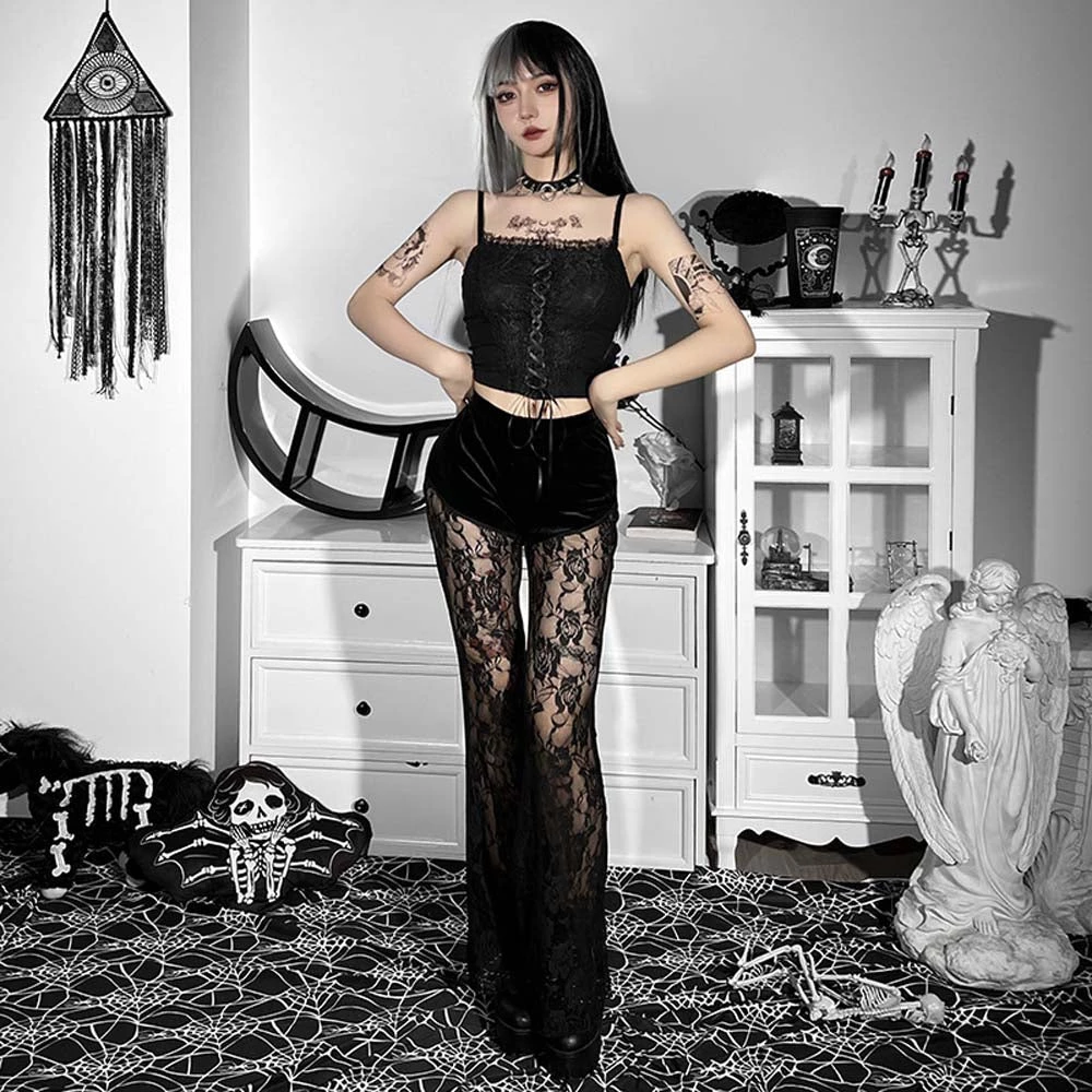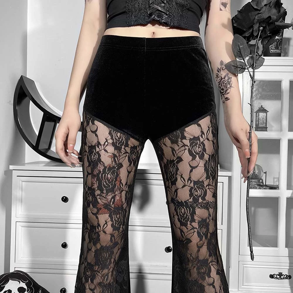 Midnight’s Garden Mesh Pants. These velvet pants have a high waist, a floral lace material, elastic waistband and a cheeky lining.