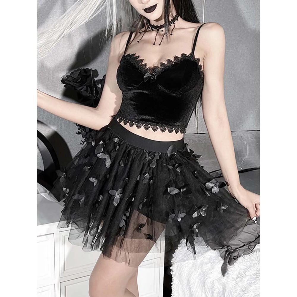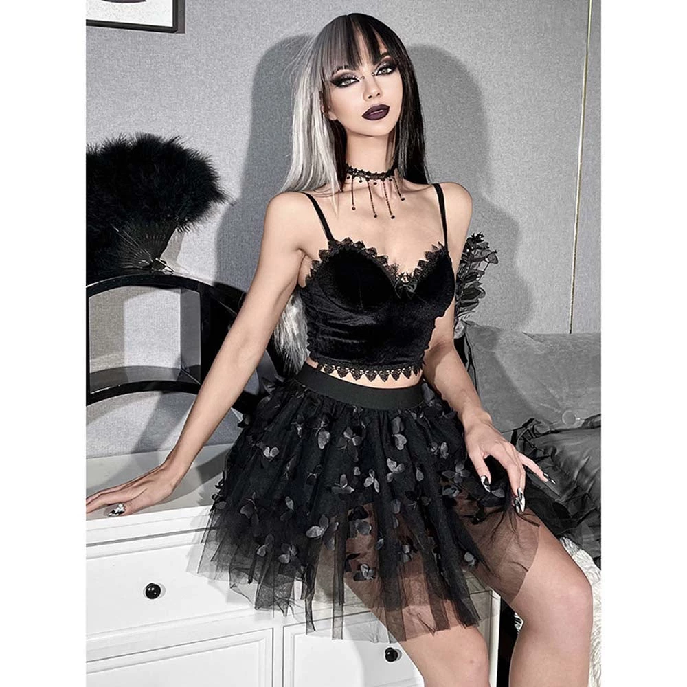 Sincerely Soulless Velvet Top. This velvet top has lace trim, a front bow and adjustable straps.