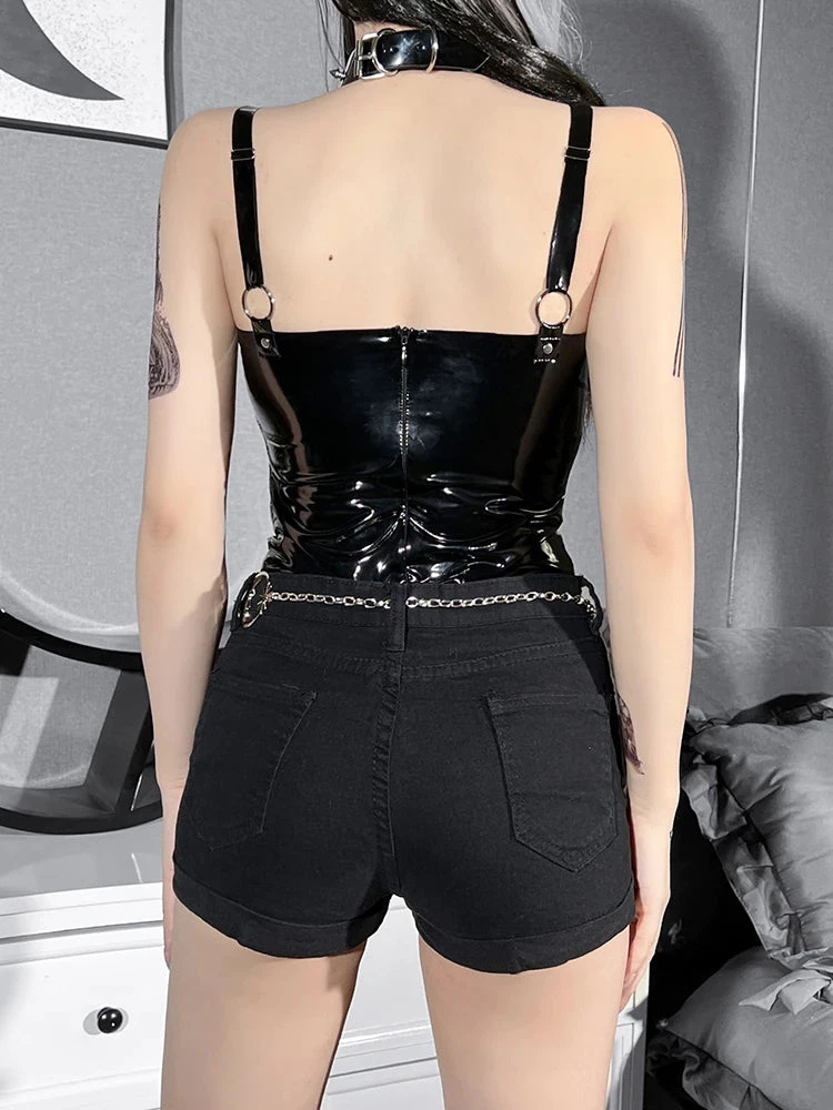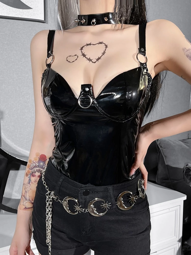 Wicked Dreams Vinyl Bodysuit. This sexy vinyl bodysuit has o-ring details, an underwire bust, adjustable straps and a back zip closure.