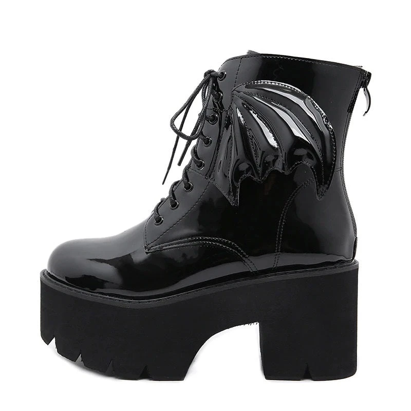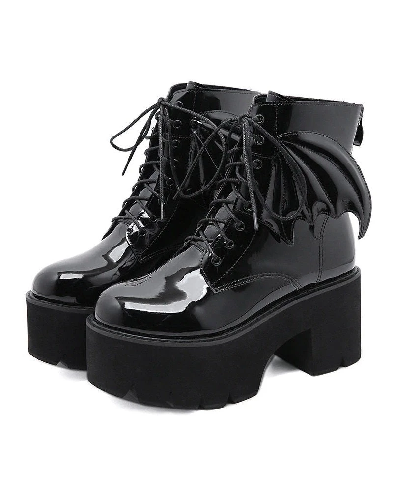 Nocturnal Platform Boots cuz you come alive in the night time. These lace-up boots have spooky bat wing details laced on top with a zipper closure on the back.