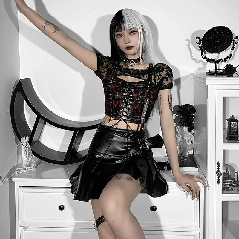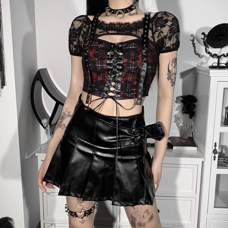 Plaid Riot Crop Top. This short sleeve top has a plaid pattern, front lace-up closure design, lace shrug detail and back, buckle shoulder straps and cropped fit.