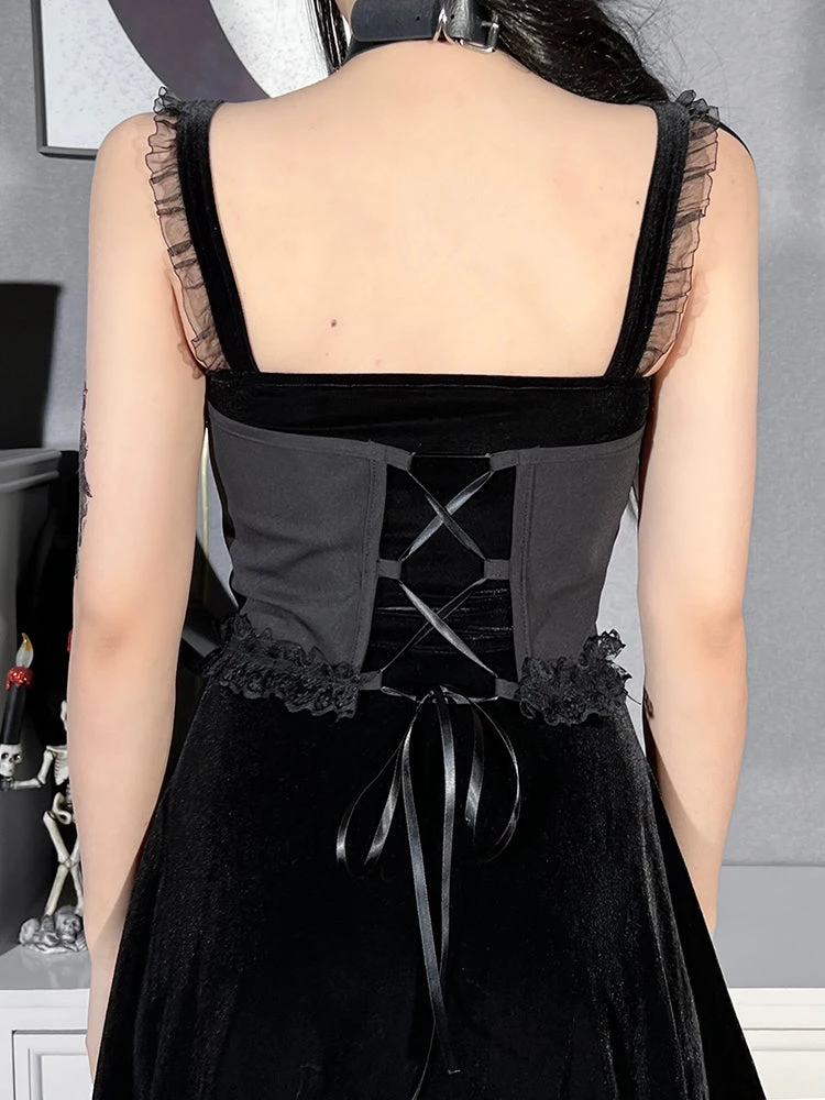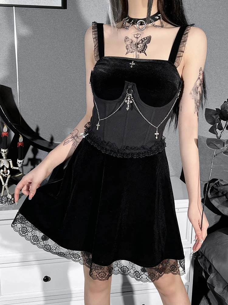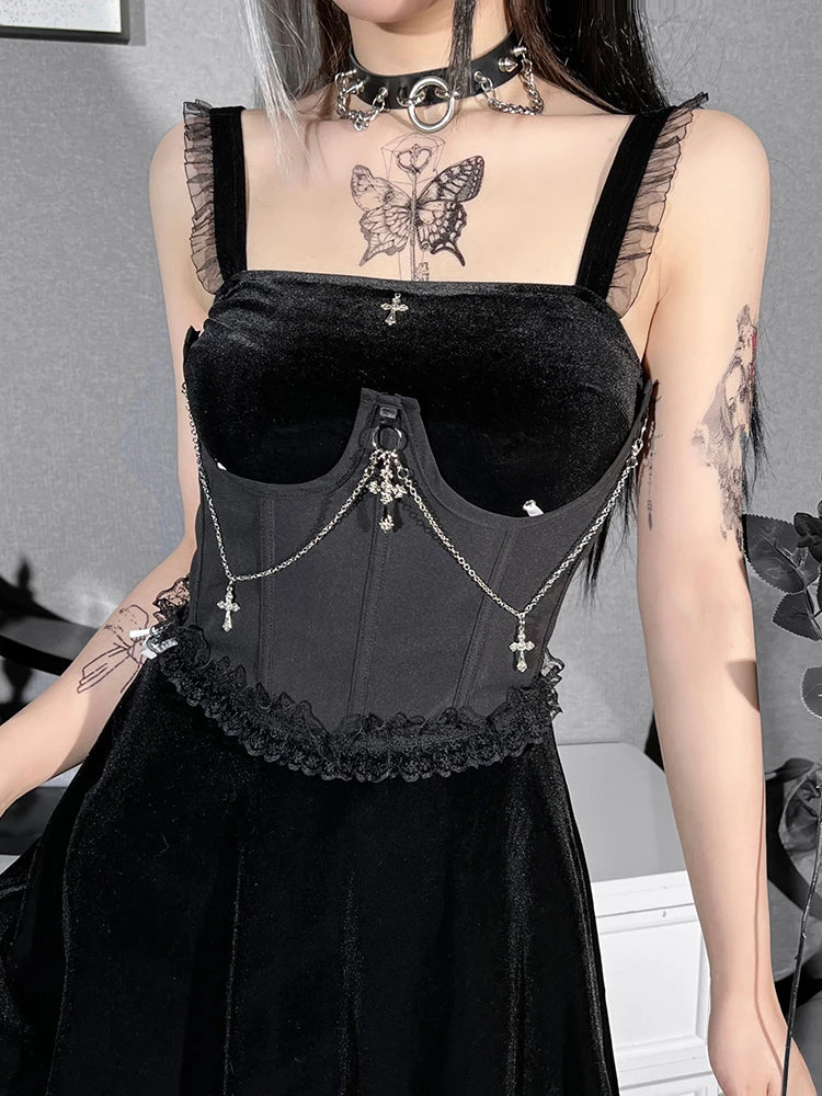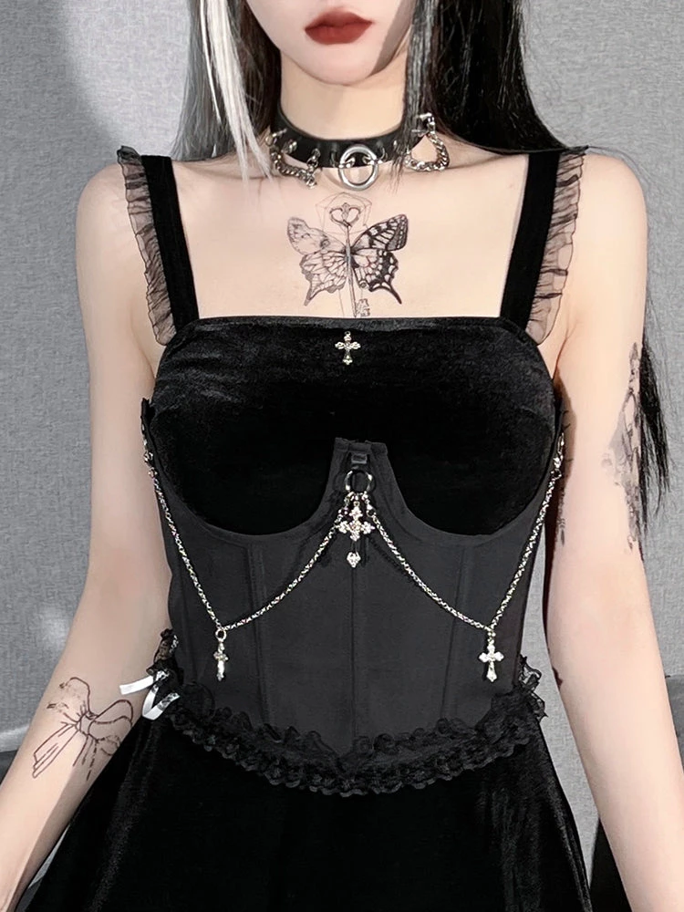 Pray For Me Underbust Corset. This corset top has an underbust fit, a lace hem trim, chain hardware with cross pendants and a satin ribbon lace up in back.