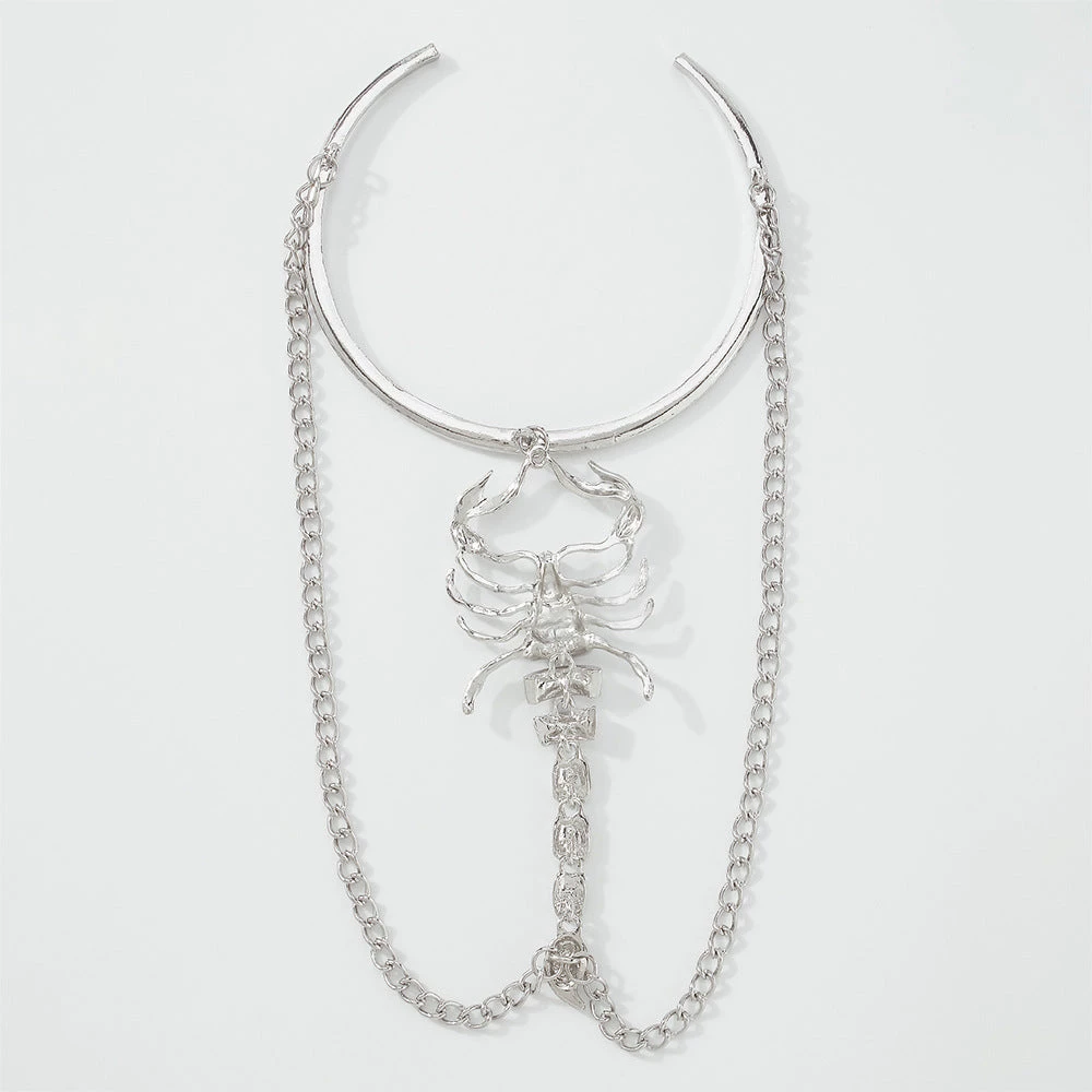 Ready To Strike Scorpion Arm Cuff. This arm cuff has a scorpion detail with rhinestones and layered chains.