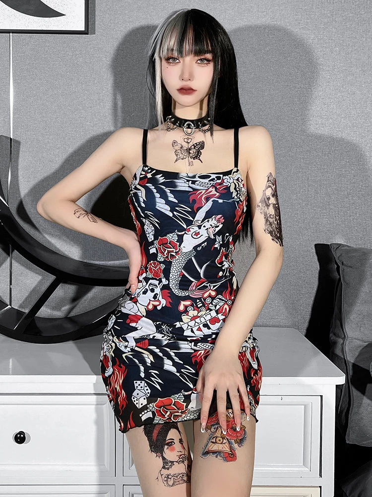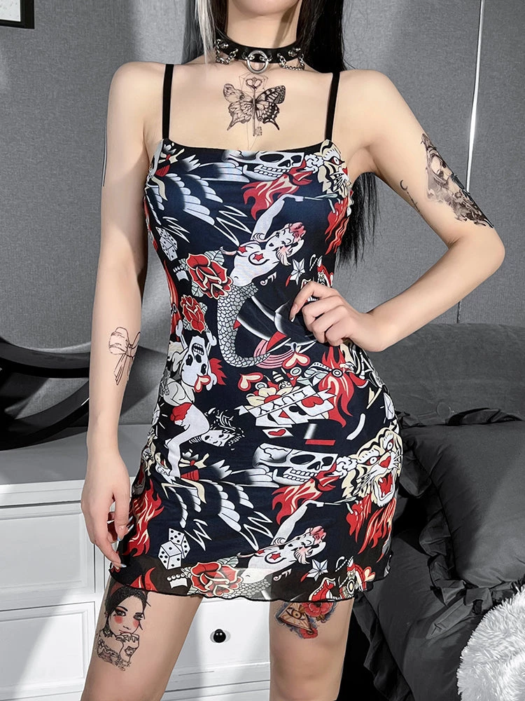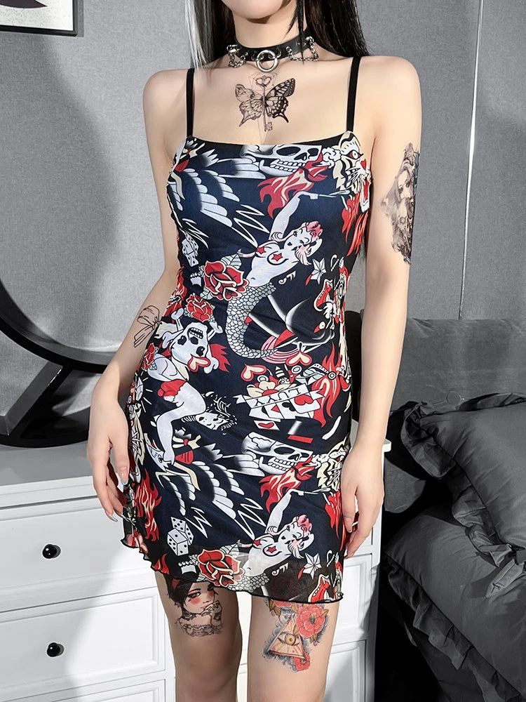 Rock The Block Mini Dress. This mini dress has a mesh top layer with a tattoo print all over, lettuce hem and an adjustable straps.