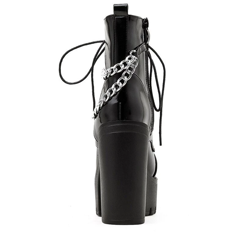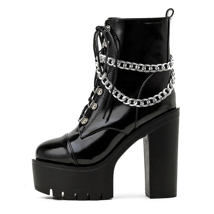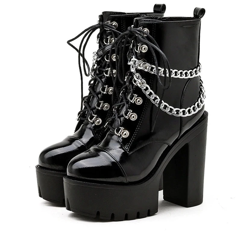 Sassy Stepper Lace Up Boots cuz you got an attitude but they like it. These wicked boots have sikk silver chain deet, platform soles, chunky heels, and inside zipper closures