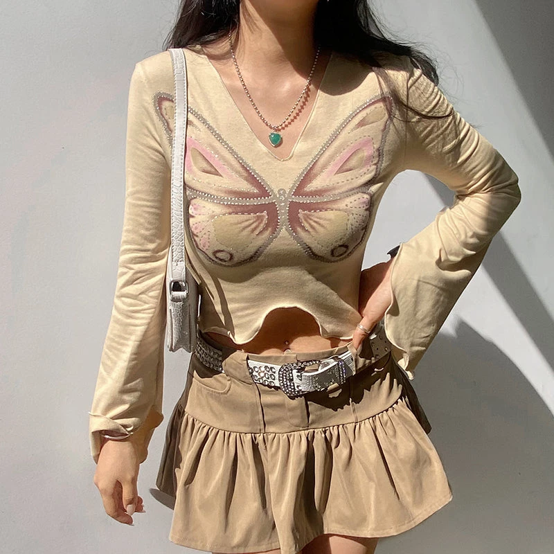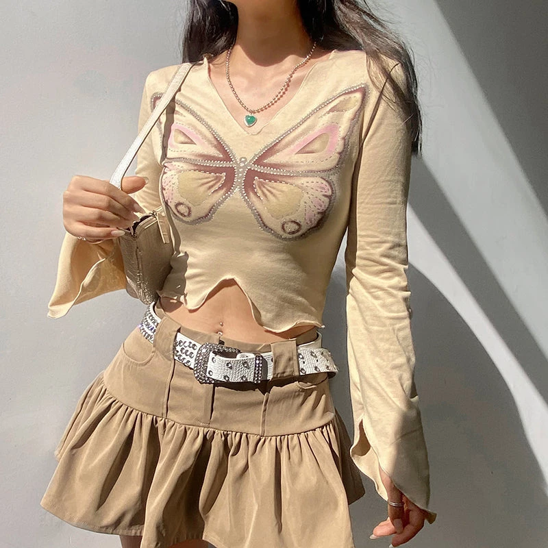 Social Butterfly Crop Top. This crop top comes with long bell sleeves, a v-neck, asymmetrical hem, a lettuce edge trims and butterfly graphics.
