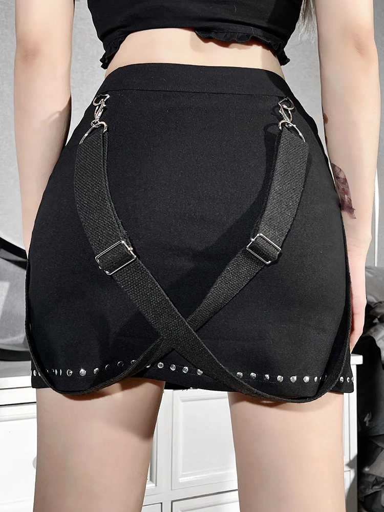 Steel Heart Mini Skirt. This mini skirt has an a-line fit, a high rise waistline, detachable straps on the sides, stud detailing and a front zipper closure.