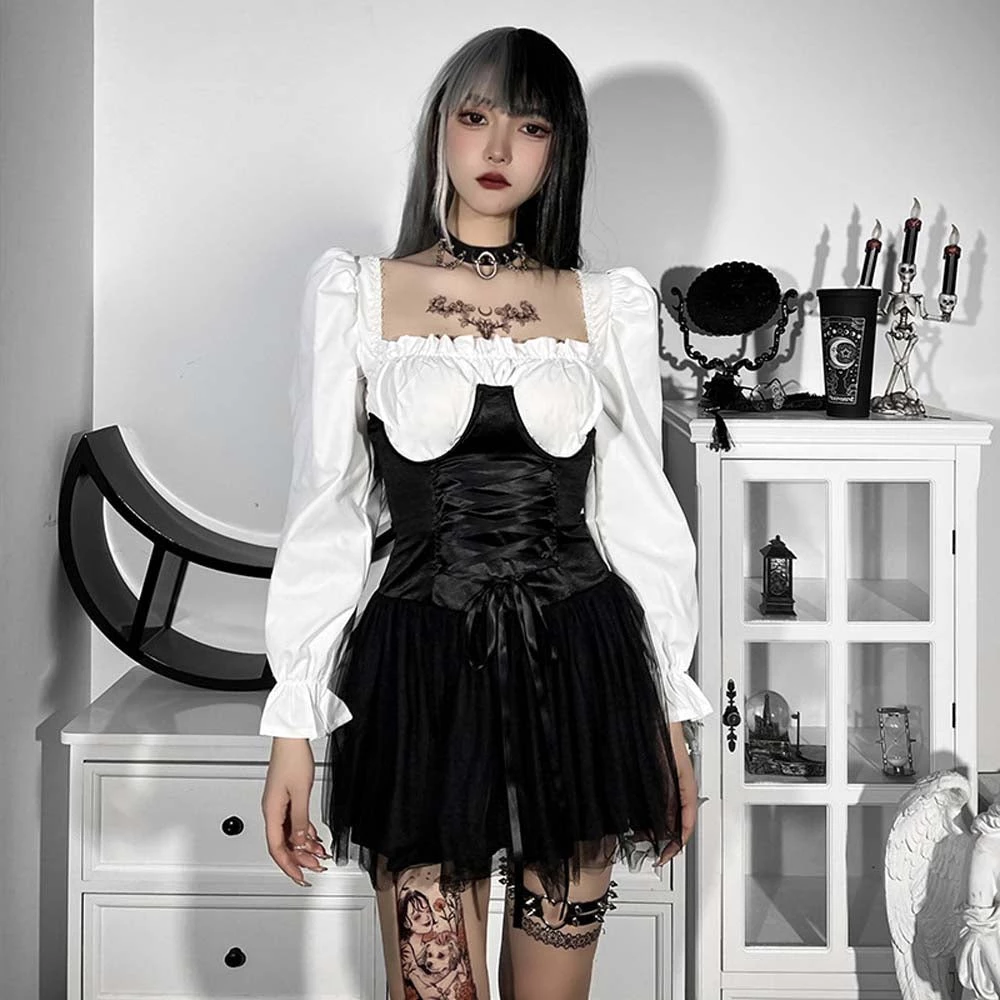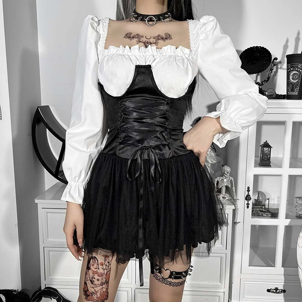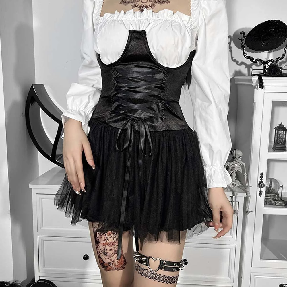 Sweet Nightmare Corset Skirt. This mini skirt has a waist corset lace up design with a hidden back zipper closure and a layered ruffle mesh skirt.