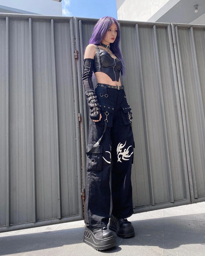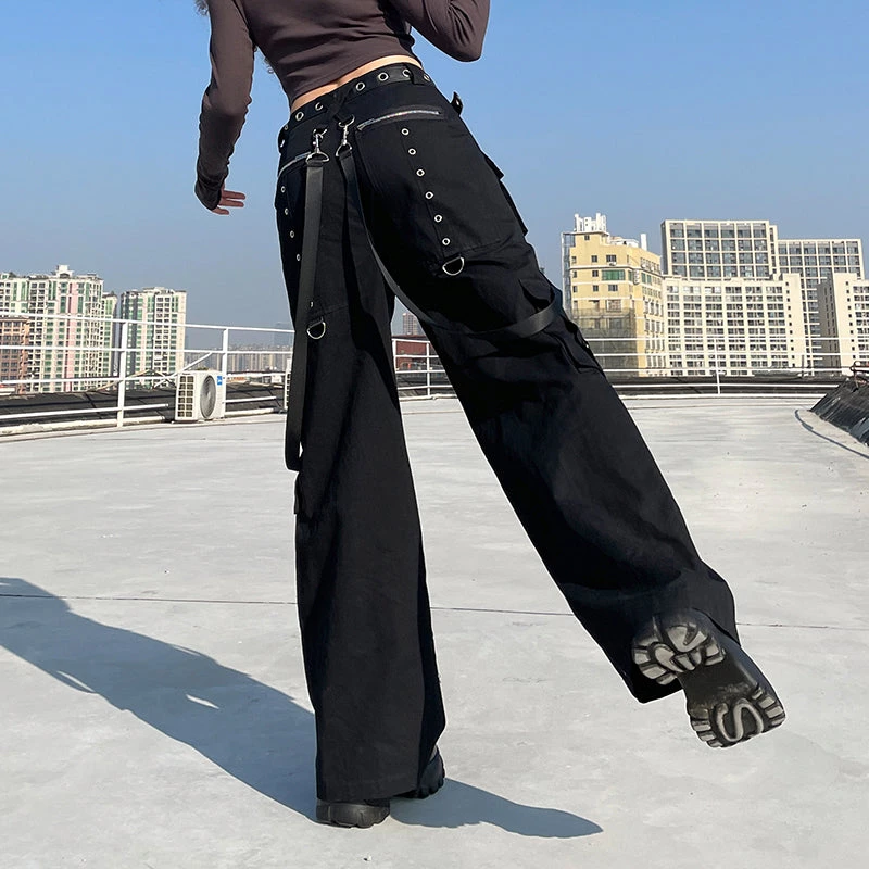 Tattoo Strappy Oversized Pants. These wide leg pants have detachable bondage straps, front pockets with eyelets, side pockets with D-rings and back pockets with zippers,tattoo graphic on the knees and button and fly closure.