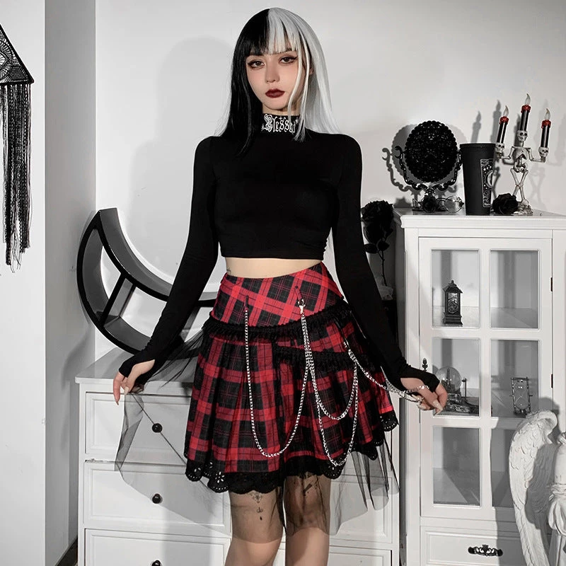 Trouble Starter Plaid Skirt. This mini skirt has a plaid pattern all over, a detachable chain across the skirt, half skirt sheer layer, a high-waisted fit, back hidden zipper closure and lace trim details.