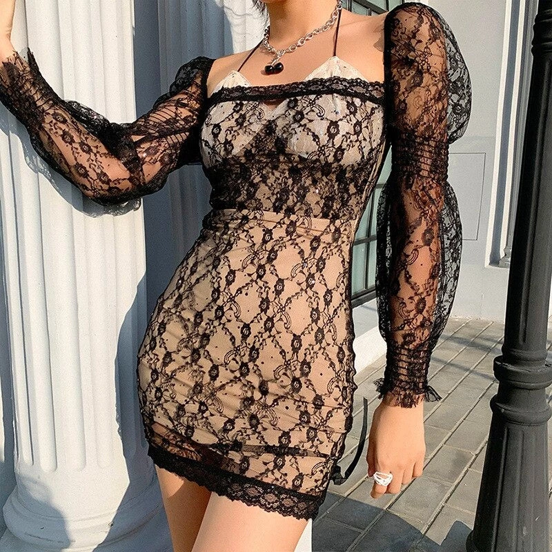 True Love Lace Dress because you’re enchanted. This mini dress has an under layer and lace top layer and puff sleeves.
