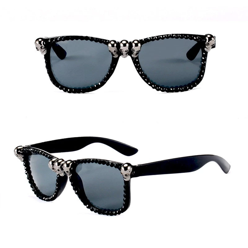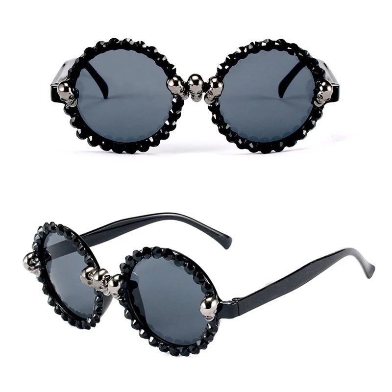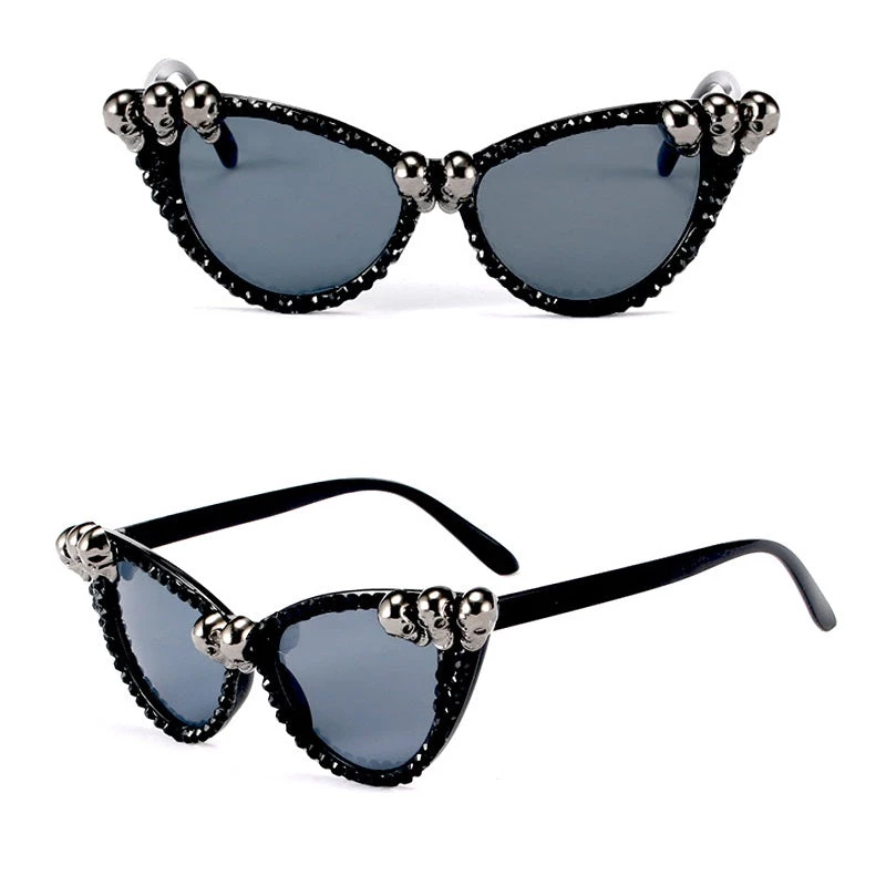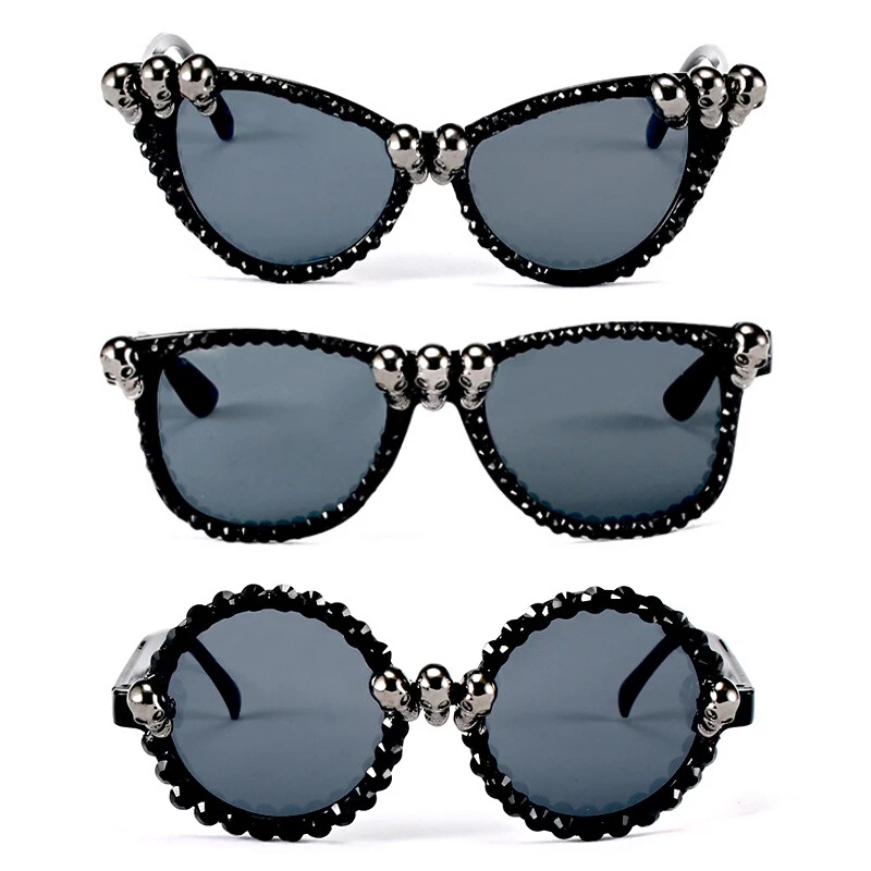 Vanishing Visions Skull Sunglasses. Look wicked cute in these oversized sunglasses that available in 3 shapes, decorated with skulls and black beads all over and dark tinted lenses.
