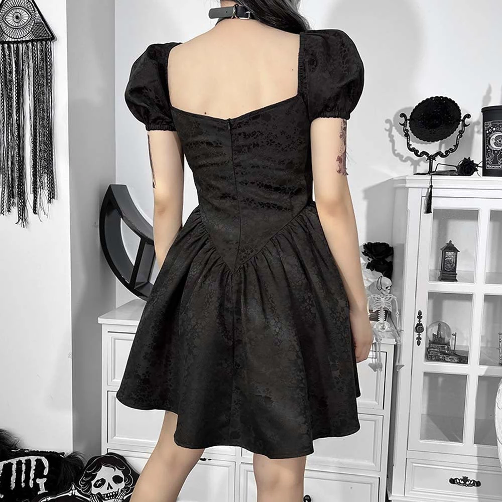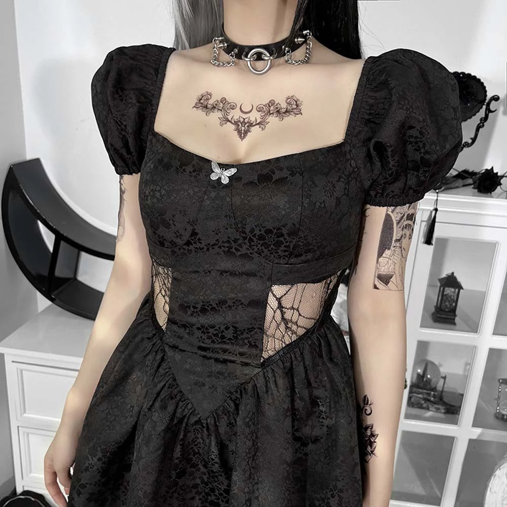 Wicked Butterfly Puff Sleeve Dress. This wicked babydoll dress has a lil butterfly on the front, floral pattern construction all over, side web mesh panels, short puff sleeves and a back zip closure.