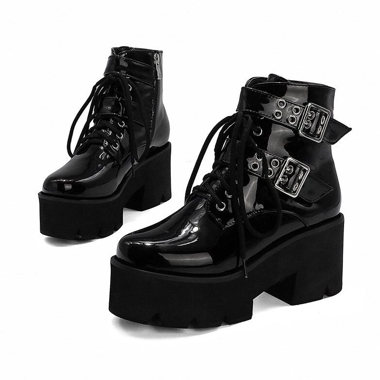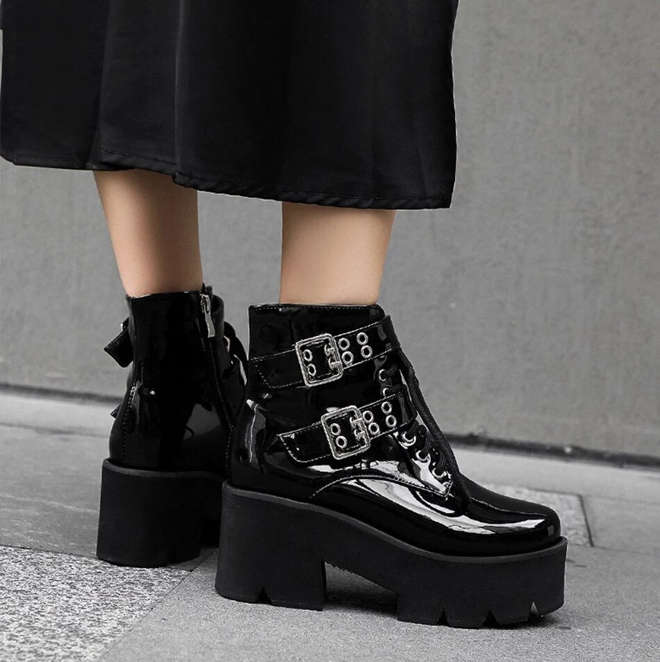 Wicked Energy Platform Boots cuz they don’t know how powerful you are babe. These dope ankle boots made of vegan patent leather, wrap buckle straps wih eyelets and front lace up closures.