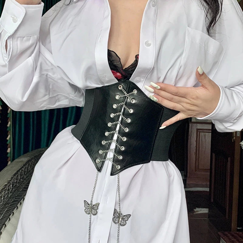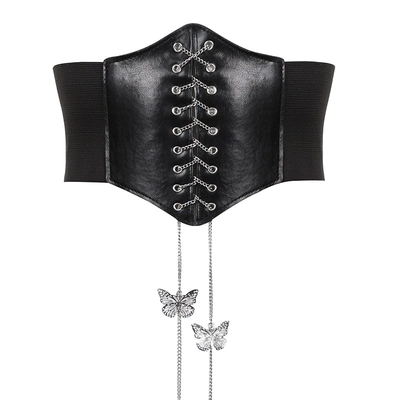 Wicked Fly With Me Corset. This underbust corset has dangling butterfly-shaped hardware at front, adjustable lace-up ties for a waist-snatching fit, a vegan leather panel at front and a stretchy waistband.