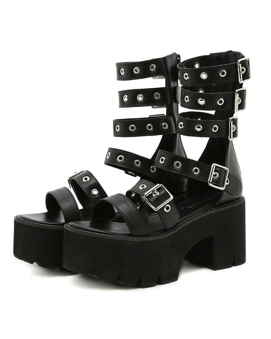 Wicked Warrior Gladiator Sandals. These gladiators constructed from black vegan leather with a straped design with eyelet deets, buckle closures and a back exposed zipper closure.
